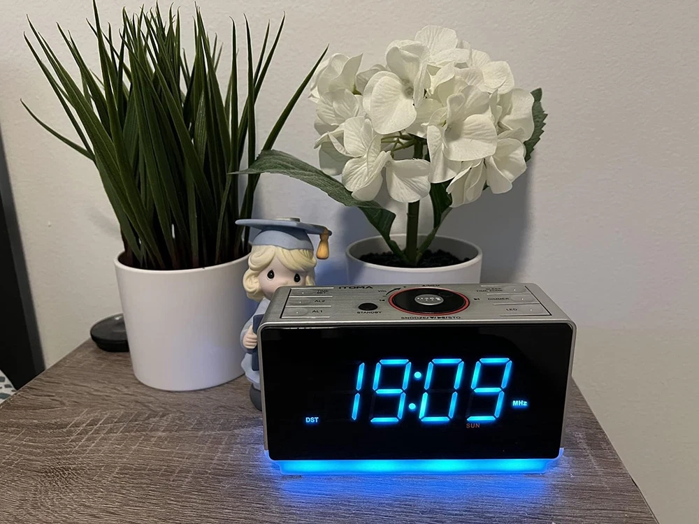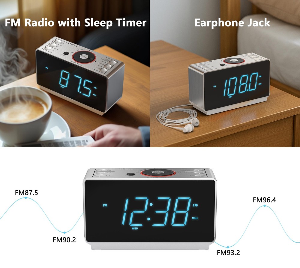 This alarm clock radio is a game-changer! The huge ice-blue display is super bright and easy to read from across the room. I love the crisp FM radio with 20 presets and great reception thanks to the external antenna. The dual alarms are perfect for different schedules—you can set separate wake-up times with radio or buzzer sounds and adjust the volume just right. The snooze function is a lifesaver, and the Bluetooth speaker is a nice bonus for streaming music. It’s packed with features yet simple to use, making mornings so much smoother. Highly recommend!