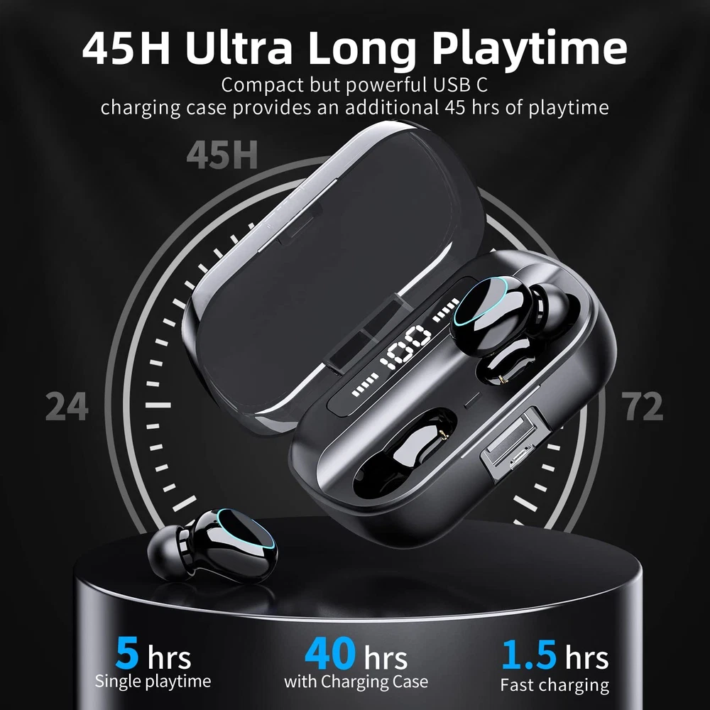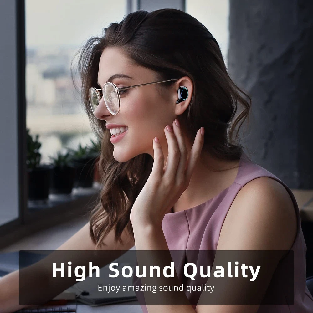 【Bluetooth 5.1 & One-Step Pairing 】The latest Bluetooth 5.1 with TWS technology on both bluetooth earbuds, provides faster pairing, stable connection and signal transmission (32ft no-obstacle range). Only need to take out two earbuds or any single earbud after you open Bluetooth function, they will open and connect automatically. Powerful Bluetooth 5.1 chip that perfectly matches tablets, laptops, iOS, and Android smartphones! 【IPX7 Waterproof Bluetooth Earbud】Wireless earphones are certified with IPX7 waterproof rating and nano-coating materials which prevent any splashes and water penetration.With ergonomics and sports design, it can be firmly fixed in the ear canal even during strenuous exercise. Very suitable for use during exercise. 【Hi-Fi Stereo Sound Quality】Wireless earbuds has the built-in high-quality audio chip and 10mm dynamic speakers for more delicate sound processing. Equipped with the latest CVC 8.0 noise reduction technology to give you a crystal clarity sound quality and 3D deep bass stereo, Making you feel personally on the scene of music during sports, running or hiking even in a loud environment. 【LED Display & 3500mAh Charging Case】Bluetooth earbuds Charging Case adopted LED battery display design, it'll indicate how much battery remaining in the charging case.about 5-6 hours continuous music playtime for a single full charge(only 1.5h charge time). Charging Case Equipped with 3500mAh Ultra Large Capacity battery , You can also use the charging case as a mobile power source to charge mobile phones or other mobile devices. 【Guarantee Return Policy & Package】3 months return policy provided. If for any reason you're not completely satisfied with our wireless Bluetooth earbuds, please don't hesitate to contact us. Package content: Earphones, Charging Case, Charging Cable, Ear Tips (S, M, L), User Manual