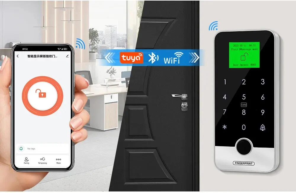 Bluetooth Tuya APP Smart Fingerprint RFID Access Control Keypad Touch IP65 Waterproof 13.56MHz Door Opener Keyless Lock System WG26 Product Specification: Material: high quality ABS plastic Working voltage: DC 12V Working current: 500mA Fingerprint capacity: 300 Card capacity: 1000 Password capacity: 1000 Panel: touch screen panel Working frequency: 13.56MHz Card reading type: support MF 1K compatible card Card reading distance: 0-5CM ldentification method: Fingerprint, RFID Card, Password, Tuya APP. Record capacity: Mobile phone APP remotely view the latest door opening information. Backlight: has white backlight Waterproof function: IP65 Doorbell button: support wired doorbell Display Language (S300X): Supports Chinese, English, French, German, Spanish, Latin, Romanian, Italian. Working temperature: -20。C ~ 50。C Working Humidity: 20% ~ 90% Product size of S300A: 132*75*18mm Product size of S300X: 163*75*18mm Product Details: 1.8inch Color TFT Screen, Easy to program with the display. Display supports Chinese, English, French, German, Spanish, Latin, Romanian, Italian language Time and date show on display when standby(S300X model) 360 degree comprehensive fingerprint recognition, fast identify speed For different angles of fingerprints, it can be quickly and accurately identified IP65 Waterproof. Can be installed outdoor. Has a door bell button, can install a wired door bell. White backlight keypad. The digits number can be seen clearly even at dark. Can set Normally Open model Frequent entry and exit can be set to normally open model Support Fingerprint, RFID Card, Password, Tuya APP, dual verification to unlock the door Support 300 Fingerprints, 1000 RFID cards, 1000 password user capacity, Mobile phone APP remotely view the latest opening information, more secure! Support Tuya APP remote unlocking Support only one mobile phone to use Tuya APP. Need to delete device if other people want to use Tuya APP About Tuya APP 1) Supports language: Chinese, English. 2) Can add fingerprints, password, RFID cards on the APP, it's very convenient. 3) Can unlock the door with Tuya APP unlocking button, or Tuya password. 4) Can view unlock records. Click reminder information to view logs. 5) Support only one mobile phone to use Tuya APP. Need to delete device if other people want to use Tuya APP. Tuya APP Setting Instruction 1) Scan QR code, or Search "Tuya" on App store to download it. 2) Turn on Tuya APP to add new equipment. 3) Trun on bluetooth, Select "Auto scan", click "Searching". 4) Connect with available devices, click "Next". 5) Connecting, Added successfully, click "Done". 6) Click setting, turn on "remote unlock setting". 7) Select user, click "+" to add user, fill in name, click next step. 8) Add user fingerprints, Code, Cards. 9) Add ordinary user by clicking ordinary member “+”. 10) Add code user by Time-Limited: input phone number, set effective time and ineffective time, click "Send". 11) Add temporary code: click "One-Time'", input phone number, click "Send". (Notice: The code valid time for 1 hours and only can be used once.) Easy installation and operation Based on advanced technology, fast recognition speed, high sensitivity. S300X Model, with 1.8inch display screen. S300A model, without display screen (other function is same with S300X model) RFID Keyfobs: Material: ABS Operating frequency: 13.56MHz Detection range: 0-5cm Each card pre programmed and has a metal keyring. Wiring Diagram (The power supply, electric locks, door exit button are not included in the package, need to purchase extra.)