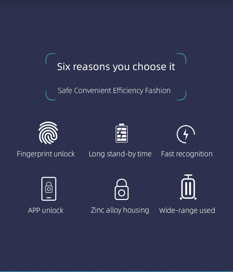 Product Description If you have any questions, please contact customer service first, do not open disputes easily, thank you! Specification: Bluetooth unlock app unlock Fingerprint unlocking biometrics Lithium battery capacity: 150mAh Storage capacity: 10 groups fingerprints FAR:<0.002% Working temperature: - 20 ℃ ~ + 70 ℃ Padlock: 3.7V 300mAh Charging voltage: 5V 1A APP: Tuya ldentifying direction: Support 360 arbitrary direction Pressing fingerprint recognition:Recognition resolution 508 DPI Lock body material: ADC12 zinc alloy Fingerprint setting short press to unlock, long press 5S to set Fingerprint, long press 10s to delete fingerprint Package Including: 1X Tuya Padlock 1X Charge Cable 1X Manual Payment Shipping Contact Us We accept paypal payments and all payments authorized by eBay. 1.We ship to your eBay or Paypal address. Please make sure your eBay and Paypal address is correct before you pay. 2.Items will be shipped within 1-2 business day when we received payment. 3.Delivery time depends on destination and other factors We strive for 100% customer satisfaction! Postive Feedback is very important to us. If you have any questions, please feel free to contact us via "Ask seller a question" , we will reply your email within 24 Working hours. Payment We accept paypal payments and all payments authorized by eBay. Shipping 1.We ship to your eBay or Paypal address. Please make sure your eBay and Paypal address is correct before you pay. 2.Items will be shipped within 1-2 business day when we received payment. 3.Delivery time depends on destination and other factors Contact Us We strive for 100% customer satisfaction! Postive Feedback is very important to us. If you have any questions, please feel free to contact us via "Ask seller a question" , we will reply your email within 24 Working hours. powered by