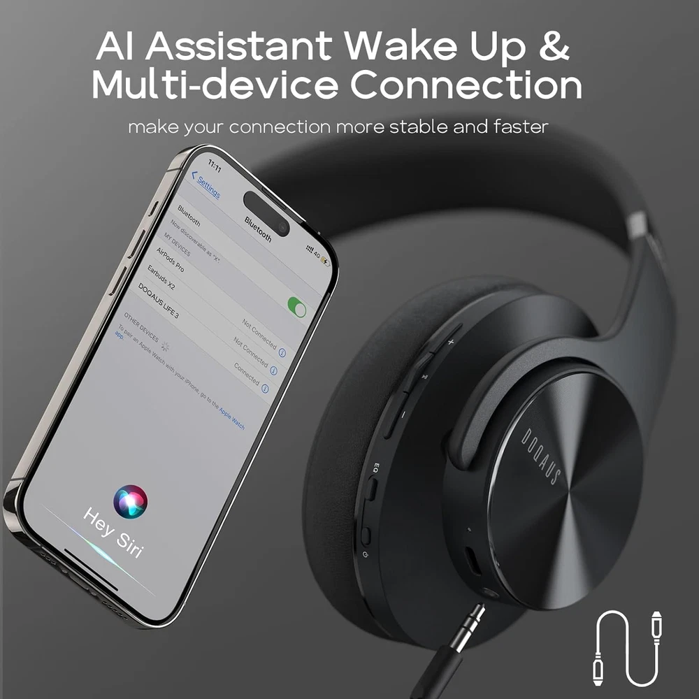 Store New Arrivals Add to Favorite View Feedback Contact Bluetooth Headphones over Ear 90 Hours Playtime Wireless Headphones with 3 EQ Modes Noise Isolating Hifi Stereo Headphones with Deep Bass, Microphone, Soft Earpads for Cellphone/Pc (Black) Description Age Range Description kids, mens, womens, teens, and above Frequency Range 20HZ-20000HZ Number of Items 1 Control Method Touch Compatible Devices Smart Phone, iPhone, Android, iPad, Computer, Mac/Windows Laptop, PC, TV, All Bluetooth Enabled Device or with 3.5mm Audio Output Theme Audio books, Study, Movie, School, TV Series, Biking, Fantasy, Cartoon, Sports, Online-work, Working out Noise Control Sound Isolation Headphones Ear Placement Over Ear Bluetooth Range 10 Meters Controller Type Built-in Control Type Media Control Carrying Case Weight 1 Ounces Model Number LIFE 3 Headphone Folding Features Over Ear Headphone Jack 3.5 mm Jack Package Type Standard Packing Model Name LIFE 3 Ear Placement Over Ear Audio Driver Type Dynamic Driver Additional Features Study/School/Online class/Reading/Reading/Audiobooks/Ect., Exercise/Sport/Outdoors/Workout/Gym/Woking out/Cycling/Exercising/Snowboarding/Running/Motorcycling/Skateboarding/Biking/Ect., Office/Meeting/Online-work/Calling/Online working/Outdoor/Travel/Airplane/Ect., Home/Movie/Music/TV Series/Gaming/Cartoon/Fantasy/Ect., HIFI Stereo Audio, 90H Play Time, 3EQ Modes, ANC Microphone, Wireless/Wired, Adjustable Headband, Lightweight, Foldable Form Factor Over Ear Specific Uses For Product Meeting/Exercise/Travel/Sport/Ect., Home/office/outdoors/bus/Ect., Music/Study/School/Call/Reading//Ect. Bluetooth Version 5.3 Antenna Location Online class, Cycling, Reading, Motorcycling, Running, Snowboarding, Calling, Skateboarding, Exercising, Online working, Gaming Unit Count 1 Count Water Resistance Level Not Water Resistant Wireless Technology Bluetooth Battery Average Life 52 Hours Connectivity Technology Wireless, Bluetooth Impedance 32 Ohm Cable Features Detachable Enclosure Material Premium Memory Foam, Leather Item Weight 8.1 Ounces Color Black Frequency Response 20000 Hz Battery Charge Time 2.5 Hours Built-In Media USB charging cable, Aux audio cable, LIFE 3 Headphone over ear, Storage Pouch, User manual Audio Driver Size 40 Millimeters Style Name music listening, game playing, working, leisuring, studing, workout, gym Bluetooth 5.3 & Built-in ANC Microphone: With two 40mm large bezel driver units and Bluetooth 5.3 technology, these workout Headphones Bluetooth offer more stable transmission speed, lower latency and better audio output. The Headphones can give you wonderful music enjoyment and the built-in ENC technology microphone of the over ear Bluetooth Headphones wireless with mic automatically reduces ambient sound enables hands-free clear phone communication. Up to 90 Hours of Playtime: With up to 90 Hours of listening time in Bluetooth mode, and 10 minutes of charging for 5 hours of listening, you'll always have music to inspire you. Regardless of whether you want to use the convenience of Wireless Headphones Bluetooth or the long-lasting properties of a wired connection (3.5 mm audio cable included), you have the choice with the DOQAUS Bluetooth Headphones over ear. Optimized Sound Quality with 3 EQ Modes: DOQAUS is always up to date for better sound effects and a better listening experience. A big step that DOQAUS has taken: DOQAUS Overhead Headphones Wireless Bluetooth have 3 EQ modes tuned by professional acoustic engineer with which you can freely switch between well-balanced, bass boosted and high definition sounds. Each mode provides you with the CD quality sound. Built for Quality & Light Weight: The headband is made of high-grade nylon material, which is not easy to deform, has good elasticity and ductility, and can quickly return to its original shape even after vigorous twisting. The inside of the headband is made of silicone material, which is also the material used by big-brand gym headphones. The appropriate softness allows you to wear the overear headphones for a long time without feeling any discomfort. The logo uses delicate metal spray painting technology, making the texture more advanced. Comfortable and Specially Developed Design: The over-ear Headphones are designed for long-term comfort. The soft over-ear pillows have advanced ventilation and a unique ergonomic fit for an individual, flexible fit for every head shape. Make sure that the ear is snug around your ears for a better sound experience and immersed in the full sound. Gentle reminder: Please take off the light weight Bluetooth over ear Headphones wireless every 2-3 hours to get your ears relaxed. More Useful & Excellent Service: AI assistant wake-up and multi-device connectivity features to make your life simpler. DOQAUS Bluetooth Headphones over the ear include a refund within 30 days, 18 months replacement guarantee. For more information about DOQAUS Wireless Bluetooth Headphones, please feel free to contact customer service, all of the e-mails will be processed within 24 hours. Product Description Enjoy Your Music with DOQAUS Bluetooth Headphones The video showcases the product in use. The video guides you through product setup. The video compares multiple products. The video shows the product being unpacked. 10 minutes of charging for 5 hours of listening Bluetooth V5.3 Keep the Connection Bluetooth 5.3 ensures a fast and stable connection, providing lower latency and better audio output. Clear Hands-free Calling 1 Long Battery Life 2 Bluetooth V5.3 3 3 EQ Modes 4 Built-in ANC Microphone 5 More Useful Function Built for Quality DOQAUS Iconic Design The headband is made of high-grade nylon material, which is not easy to deform, has good elasticity and ductility, and can quickly return to its original shape even after vigorous twisting. The inside of the headband is made of silicone material, which is also the material used by big-brand headphones. The appropriate softness allows you to wear the headp