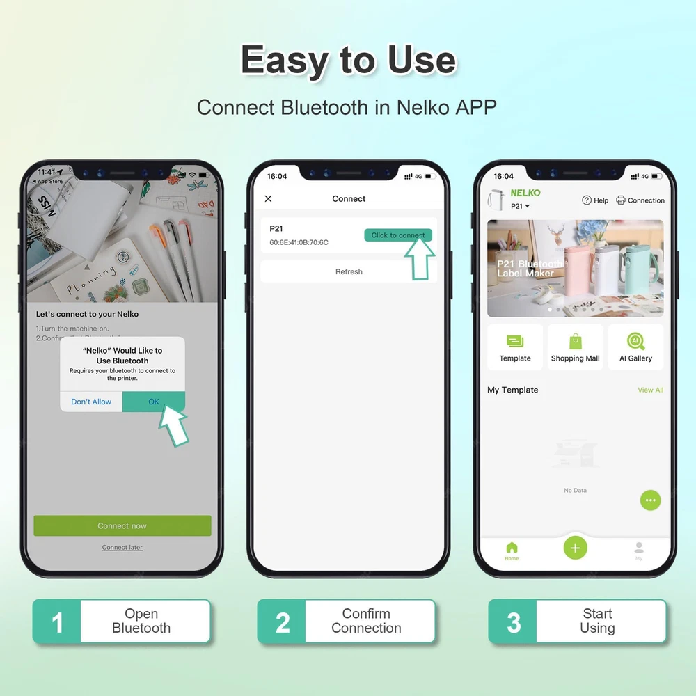 2024 New Version: Compared with the traditional label makers, half weight and size of the traditional label maker, smaller, smarter and convenient for users to carry. Wireless bluetooth label maker can slip into your pocket, allow printing anytime, anywhere. We recommend using our thermal label paper for good printing quality. Attention: For P21 APP iOS Users, iOS V2.7.0 printing multiple copies abnormal, please update APP to the latest version V2.7.1 High-quality Printing: Label Makers with BPA-Free Direct Thermal Technology. Equipped with high-speed chips and 203 DPI, you can enjoy high-definition without relying on ink or toner. Label maker built in durable rechargeable battery, it can work for a long time. This label maker is monochrome printout, which only prints black text. We can create color label and need to use color pattern label tapes for printing.(Note: Not including charging adapter, not suitable for fast charging adapter) Easy to Use: label printer with IOS & Android via bluetooth connection. Step 1: Download "" APP from Google Play or App . Step 2: Install the paper roll. Step 3: Connect the P21 bluetooth within APP. Step 4: Choose a quick template and start printing. It is not with Google phones on Android 14. This label maker machine with tape APP included more than 90 +Fonts, 10+ Languages, 450+ Materials. (Note: This label maker doesn't work with computers) Multiple Creative Function&Templates: This app of the label maker provides various features and templates, easy to create various design label stickers from App with Text, QR code, Barcode, Materials, Images, Time and Borders, etc. The length of labels is fixed, including 12X40mm, 14X40mm, 14x50mm, 14x75mm, and more. Please do not tear or destruct the green sticker on the back of the label strip , otherwise it will affect the printing effect. (Note: Continuous label tapes are not supported) Design Your Own Labels: The label maker machine with tape is widely used in life and office. For Home, organizing your clothes, food storage, cosmetics items, and mailings. For Office, office organization includes notebook tags, price tags, reminder tags, and other office supplies. For School, label maker for classroom teacher and school items, personal item identification, name tags. Labeler makers bring you fun and convenience