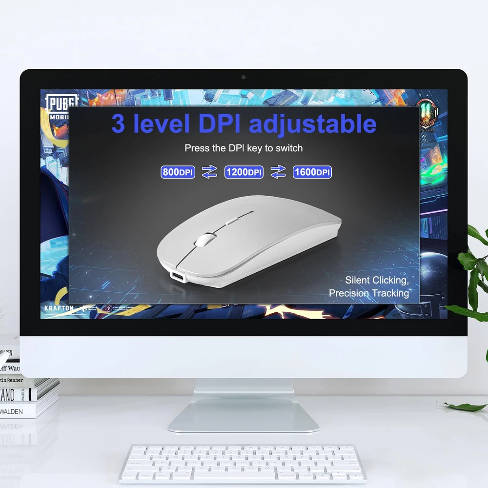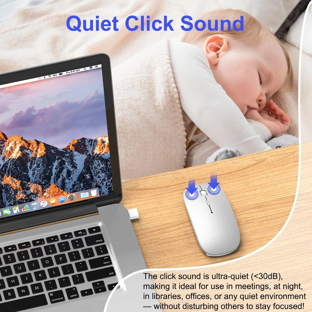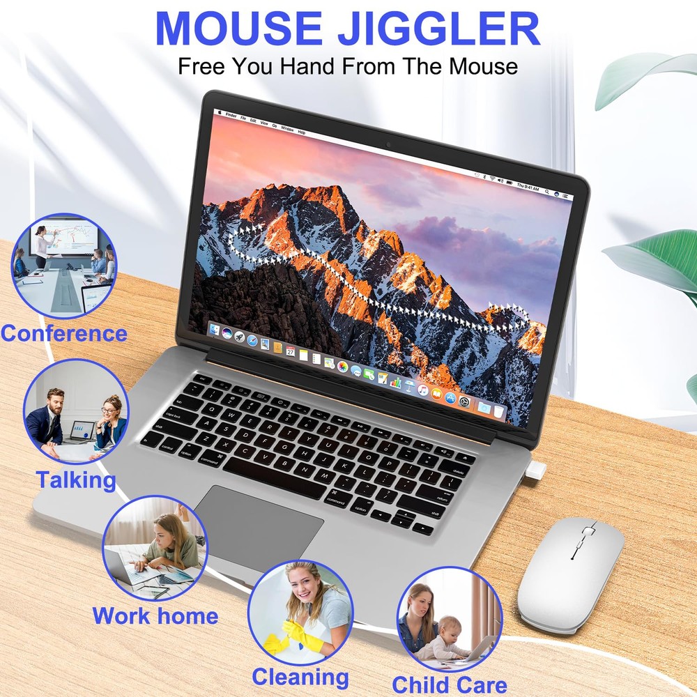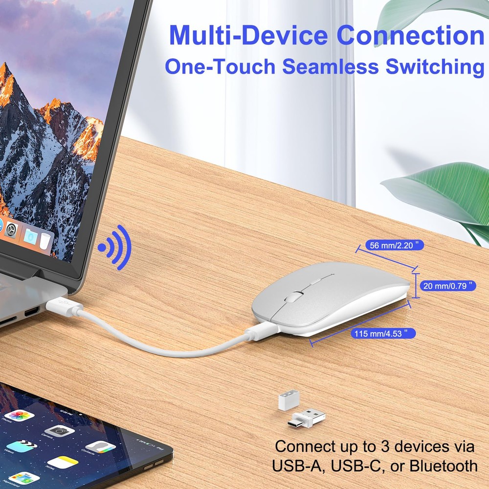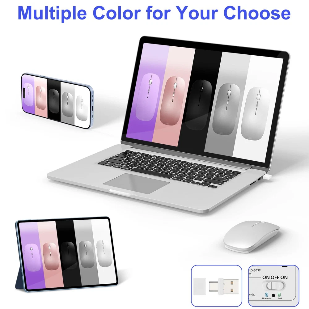 Tri-Mode Bluetooth 5.2 Wireless Mouse with 2.4G USB Receiver & USB-C Adapter&Mouse Jinger:Easily switch between Bluetooth and 2.4G USB receiver mode to suit your device. Bluetooth mode works flawlessly with MacBook Pro, MacBook Air, iMac, iPad Pro, iPad Air, iPhone, and other Bluetooth-enabled devices. The 2.4G USB receiver mode offers a reliable connection for Windows PCs, Mac desktops, and laptops with USB/USB-C ports. Mouse Jinger :Mouse Jinger offers an undetectable, driver-free solution to keep your computer awake and secure by simulating realistic mouse movement with adjustable intervals, providing seamless multi-tasking without interruptions—perfect for maintaining activity on your Apple ,Macbook , Mac,Ipad,PC, laptop, desktop or tablet. 3 Adjustable DPI for Precise Control:Choose between 3 DPI settings (800, 1200, 1600) to suit your needs. Whether you're working on detailed tasks, such as graphic design, or simply browsing the web, the advanced optical sensor ensures precise, smooth tracking on any surface. Perfect for office work, creative tasks, or leisure browsing. Elegant,Slient and Travel-Friendly Design:Designed for all-day comfort with a soft, skin-like surface and ergonomic shape, compact, slim mouse offers a quiet, mute-click experience, making it the perfect travel companion for your MacBook, iPad, iMac, or any device, ensuring seamless productivity on the go. Long Battery Life & Energy-Saving:mouse features a high-capacity Li-polymer battery for extended use. It automatically powers off when your device shuts down or the receiver is disconnected, and enters sleep mode after 8 minutes of inactivity. Simply click to wake it up—efficient and hassle-free. Wide Compatibility :Tri-Mode wireless mouse is compatible with a wide range of operating systems, including iPad, Mac, Windows, Linux, Chrome , and more. Whether you're working on your MacBook in the office or using your iPad at home, wireless bluetooth mouse ensures smooth, responsive performance on virtually any device.