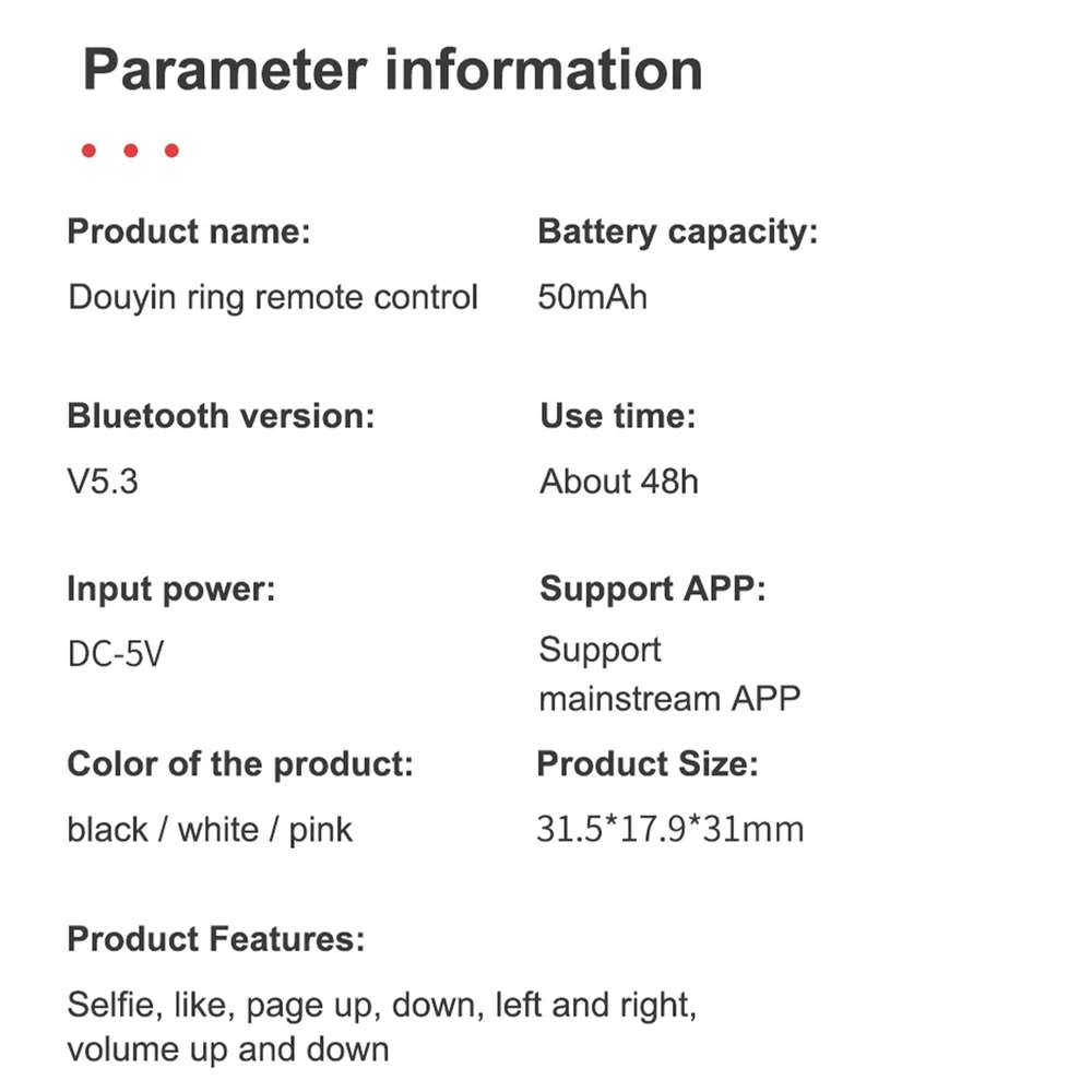 Bluetooth Compatible Phone Scrolling Page Turner Ring Fingertip Remote Control Wireless Design: The Wireless Remote Control Page Turner allows you to swipe videos on short video easily. It can be used to scroll through videos, double tap to like, pause and play. It makes you no need to touch your phone again, free your hands. Simple to Use: The Wireless Clicker for Phone is very easy to use, just click the button, double-click the button, and long-press the button to perform a series of operations. If you're watching a short video, you can click the button to play the next video, then double-tap the button to like the video you like. If you want to take a photo, after placing the phone, press and hold for 3 seconds to take a photo. High-Grade Material: The Wireless Camera Remote is made of high-grade ABS material and has an ergonomic rings design, which will not get tired after long-term use. Suitable for Short Video: Multi-function Fingertip Page Turner can be connected stably within 15 meters. It works with the most popular short video and ebook apps. Widely Applicable: The durable Remote Control for Cell Phone is compatible with IOS and Android smartphone and tablet system devices, convenient to use. Description: 1. It can be used to scroll through videos, double tap to like, pause and play. 2. You only need to click the button of Wireless Clicker for Phone, double-click the button, and long-press the button to perform a series of operations. 3. It is made of high-grade ABS material and has an ergonomic circle design, which will not get tired after long-term use. 4. Suitable for IOS and Android smartphone and tablet system devices. Specification: Product color: black/white/pink Product model: JX-05 Product feature: Short video page up and down, double click to save, take photos and video, volume increase and decrease, Type-C charging iWireless version::Ver.5.3 Support protocol: EDR+BLE Transmit power: Classll(-6dBm~+4dBm) Frequency (Hz): 2.40GHz~2.48GHz Wireless transmission distance: 15 meters/590.55 inches Charging interface: Type-C Input current: DC 5V Battery: 30mAh *1 Battery life: 48 hours Charging time: 30 minutes Product size: 37*8*33mm/1.46*0.31*1.3 inches Product weight: 6 g Packing List: Wireless Remote Control Page Turner*1 Type-C cable*1 Manual*1 1.You can make a Credit payment via Paypal.Paypal will let you use MasterCard,Visa to pay. 2.Payment should be completed within 5 days after auction closed, or unpaid dispute will be filed for an closing auction.An unpaid case will be filled after 4 days. ● We strive for 100% customer satisfaction ! ● Positive Feedback is very important to us. ● We hope that you contact us immediately BEFORE you give us neutral or negative feedback, so that we can satisfactorily address your concerns. ● We promise to offer the lowest price and high quality produce. Dear buyers : ● Welcome to my store ! ● Your satisfaction is our top goal,we appreciate your patronizing. ● If you have any questions, please contact us before leave negative or neutral feedback, we will try our best to solve the issue to your satisfaction, thanks ! ● If you are satisfied with our service, please rate the details of the transaction (Detailed Seller Ratings) on eBay. ● Please always talk to us via ebay Message. ● We appreciate your business and look forward to growing our e-Bay sales with satisfied customers.