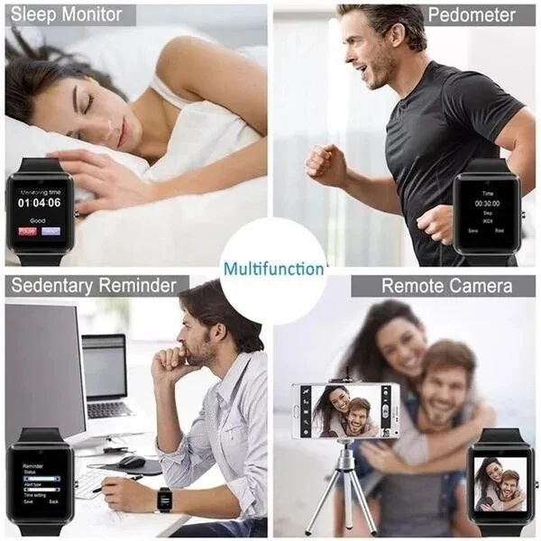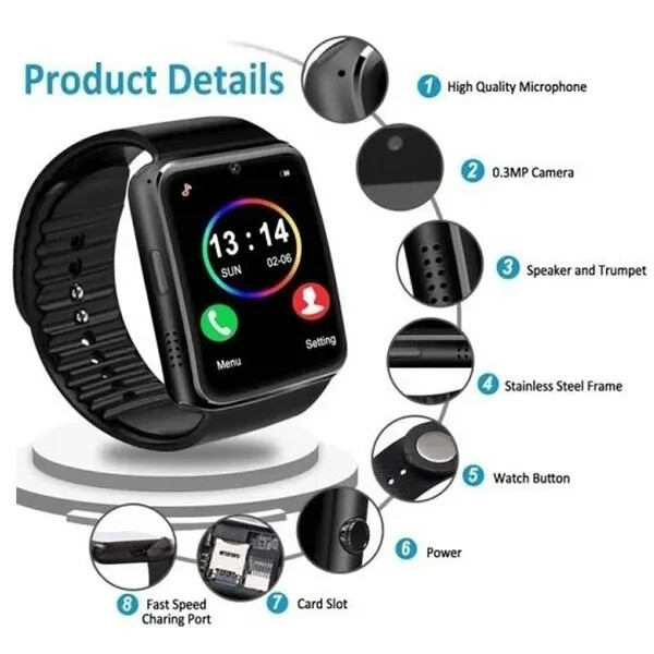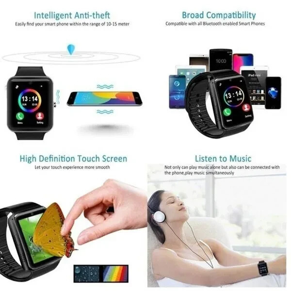 Bluetooth Smart Watch GT08 SIM Card for child kids tracker phone watch camera. Features: Battery: 380mah large-capacity polymer battery. Call function: GSM/ gprs850/900/1800 four-frequency call. VERY IMPORTANT , most areas in Australia no longer support GSM. Please check your area or travel destination for network compatibility. Call the speakerphone and record the phone. SMS: local SMS and SMS bluetooth synchronous push. Entertainment: bluetooth music playback, camera. The calculator pedometer, sitting for a long time to remind the sleep monitor to take a photo calendar stopwatch. SMS push. Time setting synchronization. Call remind: the bell and vibration to remind the clock, calendar, file management, photo albums, intelligent search, recording, music player. Specifications: Display: 1.52-inch, TFT ultra hd LCD. Resolution: 240*240 pixel. Call function: support the gsm 850/900/1800 /1900 four-frequency call. Clock display: 3 sets of display clock, free toggle. Sitting reminder: choose any time period according to your personal preference, and remind users to get up after the arrival. Memory: 32M+32M support TF card expansion. Display: 1.54 inch TFT high-definition LCD resolution: 240*240PIXL. Touch screen: capacitive touch screen.