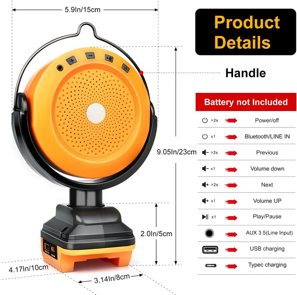Store New Arrivals Add to Favorite View Feedback Contact Bluetooth Speaker for Dewalt 18V 20V 60V Battery,Portable Bluetooth Speaker with Type C & USB Charging for Jobsite, Camping and Festival Party (No Battery) (DW20VBS) Description Item model number DW20VBS Number of Items 1 Power Source Battery Powered Country of Origin China Warranty Type Limited Processor Count 1 Includes MP3 player? Yes Controller Type Button, Mobile App Unit Count 1.0 Count Speaker Size 32 Feet Wireless Communication Technology Bluetooth Brand Edtran Material Plastic Vehicle Service Type Car Age Range (Description) Adult Number of Batteries 1 Lithium Ion batteries required. Specific Uses For Product jobsite, camping, festival party Included Components Portable Bluetooth Speaker, Type C Charging Cable, USB Charging Cable Model Name DW20VBS Subwoofer Connectivity Technology Wireless Recommended Uses For Product Laptop Water Resistance Level Not Water Resistant Connectivity Protocol Bluetooth Item Weight 1.32 pounds Connectivity Technology Bluetooth Model DW20VBS Special Feature Portable, Type C Port, USB Port Is Waterproof No Compatible Devices Tablet, Smartphone Package Dimensions 10.16 x 6.85 x 3.66 inches Maximum Range 32 Feet Batteries 1 Lithium Ion batteries required. Audio Output Mode Stereo Manufacturer DW20VBS Speaker Type 环绕声 【High Quality 】: Edtran Bluetooth speakers typically deliver clear, balanced sound, including powerful bass and clear, deep, rich, distortion-free audio, allowing you to enjoy the ultimate stereo experience. 【Unique Design】: Portable Bluetooth speaker with a concealed handle, 270-degree rotating Bluetooth speaker with USB and Type C for charging capability, compatible with various devices such as smartphones and tablets. 【Lifespan Long】:Bluetooth speaker perfectly compatible with Dewalt 18V batteries, utilizing an external battery pack, providing a longer lifespan compared to ordinary built-in batteries. It features a built-in 20W speaker and can be remotely controlled through a mobile app for adjusting music, volume, and other settings 【Low Voltage Protection】: The Bluetooth speaker is equipped with low voltage protection to prevent overload damage. The Bluetooth speaker will automatically turn off after 10 minutes of inactivity when not connected to any Bluetooth device. Bluetooth speakers typically support various connection options, including Bluetooth and AUX input 【Wide Application】: Bluetooth speakers can be used in various situations and places, including home movie viewing, outdoor activities, camping, office or workplace, travel, parties and events, allowing you to enjoy the pleasure of music and sound in different settings. Product Description Bluetooth speakers typically deliver clear, balanced sound, including powerful bass and clear, deep, rich, distortion-free audio, allowing you to enjoy the ultimate stereo experience.can be used in various situations and places, including home movie viewing, outdoor activities, camping, office or workplace, travel, parties and events, allowing you to enjoy the pleasure of music and sound in different settings. Bluetooth speaker features Clear Sound Connect Easily Compact Size Portability TROUBLESHOOTING Bluetooth not connecting 1. Another device may already be connected. Disconnect the otherdevice first and then try connecting the desired 2. Device Bluetooth is off. Turn on device Bluetooth. 3,Bluetooth speaker is in AUX mode. Remove the AUX cable fromthe port on the speaker and device.check speaker is on (Bluetooth model) 3.5mm (LINEIN)not connecting 4.check audio cable have connected ,check speaker is on (LINEIN)mode Easy Connectivity: Edtran portable Bluetooth speaker supports two types of connections. Bluetooth 5.3 ensures a fast and stable pairing with your devices, ensuring a strong connection up to 32 feet. It also supports USB and Type C audio sources while featuring charging capability. Package Contents: 1* Bluetooth Speaker 1* AUX 3.5mm Cable ABOUT US We offer the best prices around on high quality products. Our E-store includes media such as books, movies, music and games while offering electronics, toys, sporting apparel, clothing, tools, general home, garden items and more. SHIPPING We are always working hard to ensure your package arrives as soon as possible. Please understand that some factors like weather, high postal traffic, and the performance of shipping companies are outside of our control. We offer free shipping to the lower 48 states and ship within 2 business days of payment, usually sooner. We do not accept P.O. Boxes. Please provide a physical address. RETURNS We offer a 30-Day Return Policy on items which you are not completely satisfied with. You have the option for a full-refund or an exchange of the item. No returns are available on items shipped outside of the USA. PAYMENT We accept PayPal. CONTACT US This page content is yet to come Please ad us to your favorite seller and visit again later Thank You CUSTOMER SATISFACTION We try our very best to make sure every customer is completely satisfied. If there's a problem, message us! We're happy to help.