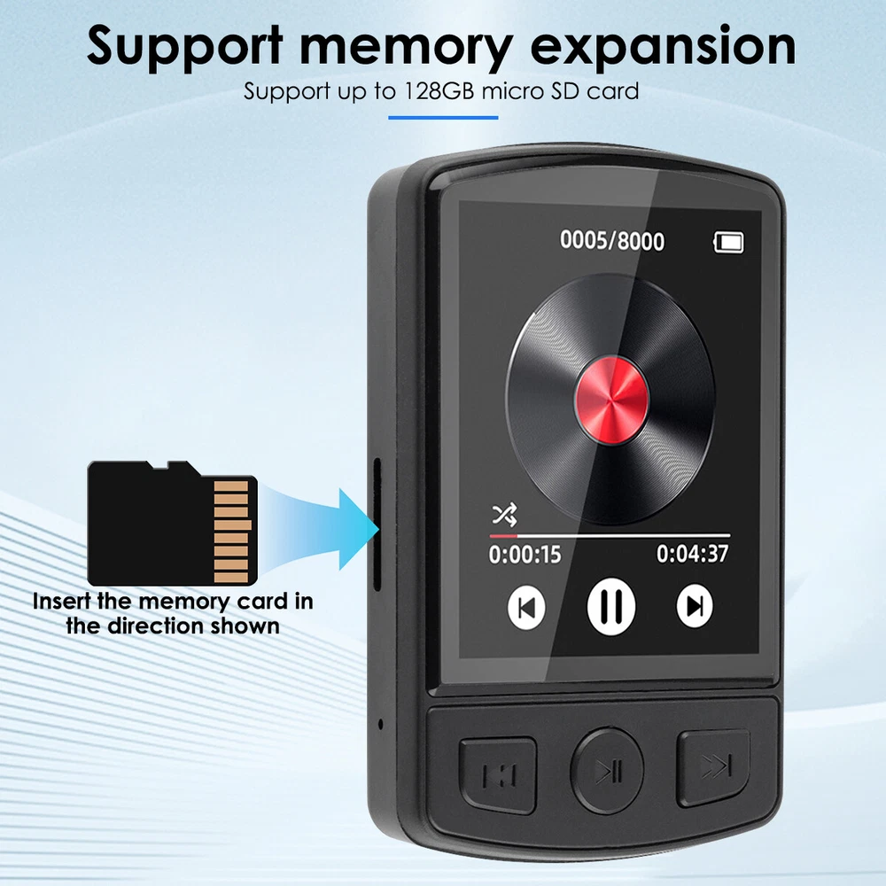 Product Description Bluetooth Sport Lossless Music MP4 MP3 Player FM Radio Recorder W/ 32GB Card US Features: ●1.77" colour screen. ●Time and date setting. ●Built-in speaker, built-in microphone. ●Music lossless hi-fi sound quality player. ●Support multi-format music playback and lyrics synchronisation. ●Rugged and durable, the front of the screen tempered glass anti-scratch. ●Support memory expansion, support up to 128GB micro SD card. ●Support recording, alarm clock, video playback, photo album, eBook, external speaker. ●Using Bluetooth 5.2, you can connect Bluetooth headset, Bluetooth speaker and other audio devices, the connection is more stable and the sound quality is better. ●You can fix the player firmly on the shoulder strap or pocket T-shirt, suitable for dancing and fitness, leisure and entertainment, hiking and cycling, running and fitness good companion. PLEASE NOTE: 1.The bluetooth of the player can not be paired with, computer bluetooth, mobile phone bluetooth! 2.Player bluetooth may not be compatible with genuine iPhone, JBL bluetooth headphones, bluetooth speakers! Specification: Product Name: MP3 Player Product Model: A7 Screen size: 1.77 inch Screen resolution: 128 * 160 Bluetooth connection: Bluetooth 5.2 Operation mode: button Video format: AVI Recording format: WAV/MP3 Picture format: JPG/JPEG/BMP Music format: MP3/WMA/APE/FLACWAV/AAC-LC Headphone port: 3.5MM Charging time: about 2 hours Battery life: 24 hours (3.5mm headphones resting to listen to music) Capacity battery: 250mAh Charging port: type-c Memory Expansion: Support up to 128G Micro SD card (not included) Language support: English/French/German/Italian/Spanish/Chinese Main features: back clip / Bluetooth / FM / recording / alarm clock / camera / e-books Product weight: 32g Product material: ABS Product size: 65*40*15mm Package Content: 1*MP3 player / 1*MP3 player + 32GB TF Card (Optional) 1*type-c cable 1*User's manual 1*3.5mm earphone Attention: 1.Please allow 1cm difference due to manual measurement! 2.Due to the difference between different monitors, the picture may not reflect the actual colour of the item. Thanks! Payment Shipping Terms Returns Contact Us We accept only. If buyer want to delay the payment because of financial problem, please contact me by the ebay message within 3 days Payment via PayPal (PayPal accepts all major credits/debit cards and eCheque) ECheque payment will tak e 3-10 days to get clear, thus DELAYing the shipment. Item will be shipped within 1-2 working day of payment cleared. All items will be checked strictly before shipping and it will be shipped to your PayPal address. Estimated delivery time is 4-8 working days (Not including weekend or public holidays) Delivery times may vary particularly during peak periods or unexpected weather conditions. In event of a very unlikely slight delay, your patience would be highly appreciated. We do not provide pick up or local collection service so far. For any issues with Defects, Return, Item Exchange request, please contact us first and send us a message first before opening any type of case or request. We devote ourselves making EVERY CUSTOMER in 100% Satisfactory and resolve any problem. We highly value and appreciate your business. Thank you. No returns will be accepted without an RMA number. Please contact us for the RMA number. Return is acceptable within 30 days of delivery. Return for replacement or money back is optional. Returned items must be in the brand new, unaltered and resalable condition. Seller is not responsible for any labor cost, expense in a dealer store, or damage due to wrong installation. Return is accepted within 14 days after the buyer's receiving the item. (Excluding contrived damagement or misusage).100% money-back Guaranteed! All product will be tested in 100% before delivery.If the item is defected by the processing of postage,Buyer has up to 14 days from date of receipt for exchange of a new one.All shipping charges for returned products are to be paid by the buyer,Please contact us for the return address All messages will be answered within 24 office hours. Please contact us either by clicking "contact seller" in the "purchase history" section or simply click "ask a question" at the bottom of this page. If you are unsatisfied with our item or service, please contact us before leaving any feedback. We are committed to resolve all issues in a friendly and satisfactory manner. We always reply to messages within 2 business days (off-duty at weekend). If you do not get a response from us, then please check your junk or spam mailbox. Payment We accept only. If buyer want to delay the payment because of financial problem, please contact me by the ebay message within 3 days Payment via PayPal (PayPal accepts all major credits/debit cards and eCheque) ECheque payment will tak e 3-10 days to get clear, thus DELAYing the shipment. Shipping Item will be shipped within 1-2 working day of payment cleared. All items will be checked strictly before shipping and it will be shipped to your PayPal address. Estimated delivery time is 4-8 working days (Not including weekend or public holidays) Delivery times may vary particularly during peak periods or unexpected weather conditions. In event of a very unlikely slight delay, your patience would be highly appreciated. We do not provide pick up or local collection service so far. Terms For any issues with Defects, Return, Item Exchange request, please contact us first and send us a message first before opening any type of case or request. We devote ourselves making EVERY CUSTOMER in 100% Satisfactory and resolve any problem. We highly value and appreciate your business. Thank you. No returns will be accepted without an RMA number. Please contact us for the RMA number. Return is acceptable within 30 days of delivery. Return for replacement or money back is optional. Returned items must be in the brand new, unaltered and resalable condition. Seller is not re