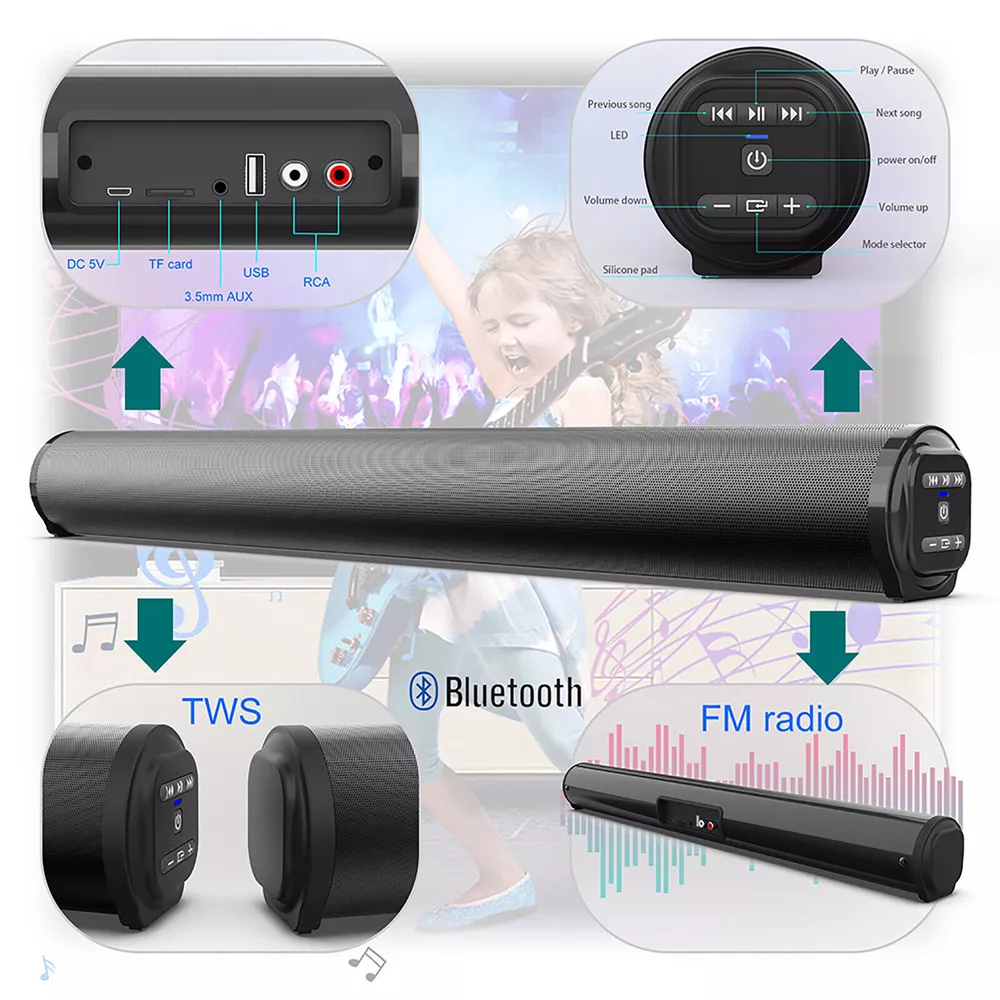 Product Description Bluetooth 5.0 Home TV Sound Bar Speaker System Wireless Subwoofer 3D Surround Feature: 1. Bluetooth 5.0 Technology: Compatible with most Bluetooth-enabled devices, connect to your smart phone instantly. And the transmission distance up to 10 meters. 2. Multiple Connection Methods: Not only come with Bluetooth function, but also support TF card, U disk, RCA,AUX playback, and support FM radio. Support A2DP, AVRCP, HSP and HF format. 3. Excellent Sound Quality: Adopted the newest configurations, this Soundbar has 4*10W built-in speakers and Bluetooth 5.0 chipset, which means it can produce greater bass and excellent sound performance. Four speakers for high performance multi-dimensional sound and an unparalleled cinematic deep bass surround sound, let you enjoy high-quality music. Watching TV at home is like watching a movie at a movie theater. It gives you a theater level sound experience. 4. Elegant Design & Long Battery Life: With the 2000mAh built-in battery (charged by USB cord included), the speaker can play music for 4H when it is fully charged. And the standby time up to 240 Hours. Just enjoy the music without needing to worry the battery. 5. High Quality: Made of high quality metal mesh material, it can effectively prevent music distortion and block external noise. 6. 6 Kinds of Sound Effects: 6 kinds of sound effects can be switched at will. To meet different sound quality needs. 7. Equipped With A Remote Control: You can remotely control the speaker and switch the sound effect through the remote control. 8. TWS Function: TWS technology allows you to pair two bluetooth speakers by wireless Bluetooth, then audio can be played in sync on two speakers (as left/right channel outputs respectively), for true double enhanced stereo sound. The 4*10W drivers enhance the bass and provide more louder sound, which will crash the party or dancing. 9. Hands-free Call: With stable bluetooth connect, nothing will get in the way between you and your phone call. Hands-free calling havenever been easier. Specifications: Item Type: Bluetooth Speaker Material: metal + plastic Waterproof rating: IPX 4 Expansion storage: 32G Bluetooth Version: 5.0 Color: Black Speaker Power: 4 * 5w Use Transmit Power: 1.49mw Transmission Frequency: 2.48ghz Transmission Distance: 10 Meters Music Playback Time: About 8 hours Supported Formats: A2DP, AVRCP, HSP AND HF Battery: 3.7V / 2000MA Signal To Noise Ratio: -80db Frequency Response: 20hz-20khz Charging Voltage: Dc 5v / 1a-2a Charging Socket: Micro USB Size: 560 x 62 x 62mm / 22.05 x 2.44 x 2.44 inch Package included: 1 * Bluetooth Speaker 1 * Remote Control 1 * Charging Cable 1 * RCA Cable 1 * User Manual About Us Shipping Terms Returns Contact Us About Item All items sold by us are being described to the best of our abilities, as accurate as possible, and with utmost conscientiousness on our part. However, to avoid any potential oversights, I respectfully request your assistance in helping us to make this a mutually satisfactory transaction by THOROUGHLY reviewing item description and photos, and asking all questions PRIOR TO BIDDING. Customer Satisfactory 1.We back our commitment with superb service, 100% full money back and a customer satisfaction guarantee. 2.I am here and ready to assist you with any questions or concerns you might have before or after the purchase. 3.My goal is to make sure you are a happy customer and pleasant shopping with us. Feedback If you are satisfied with the purchase and our total service, your comment is very important in our business success. Please take a minute to leave us a positive feedback with an overall Detailed Selling Rating (DSR) of 5. Our eBay account setup auto feedback, so eBay system gives you automatically Positive feedback back after your positive feedback left. IF YOU PLAN TO GIVE US A NEUTRAL/NEGATIVE FEEDBACK OR OPEN EBAY/PAYPAL CASE, PLEASE WRITE TO US IMMEDIATELY SO THAT WE CAN DO OUR BEST TO RESOLVE YOUR PROBLEM. United States Buyers Same business day free shipping within United States All orders will be shipped through USPS First Class, UPS and Fedex depends on the weight of the items. Shipping Time Usually ,Parcel will be delivered 2-5 working day include Handling time. Sometimes shiping time may has a little delay, such as Bad wether,Holidays We stand behind everything that we sell and will do everything possible to assure you are satisfied. When you receive your purchase if you are not 100% satisfied, please sent me ebay message and we will do our best to make you happy. If you still want to return your purchase, simply ship the item(s) back to us and we will refund your original purchase price and the original shipping charge. Buyers are responsible for the postal cost of returning the items. We must be notified of the intent to return your item within 30 days of receiving the item. Items returned must be in the same condition that they were received. How to return 1,Please ask us for return address . 2,Shipping back the package . The RMA#(Return Merchant Authorization Number = Your ebay ID) must be clearly written on the return package ,Otherwise the package will be refused. 3,Sent us the return tracking number. 4,All returns will be inspected prior to a credit being issued. 1:Returns are accepted within 60 days of purchase. 2:All returned items MUST BE in the original packaging. 3:We will be happy to assist you if if any item needs to be returned or replaced 4:Please don't open a return request before contacting us first to solve, many thanks. Sent ebay message in English If you have any questions, our Customer Service staffs welcome you to sent me ebay message. We strive to answer all questions and resolve any problems as quickly as possible. Business Hours: Monday-Saturday 9:00-17:00 About Us About Item All items sold by us are being described to the best of our abilities, as accurate as possible, and with utmost conscientiousness on our part. However, to avoid any potential oversigh