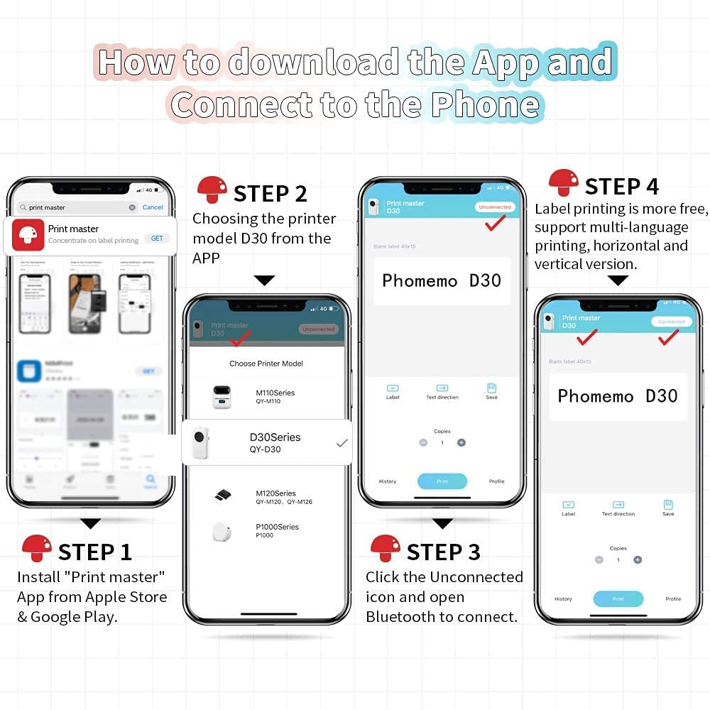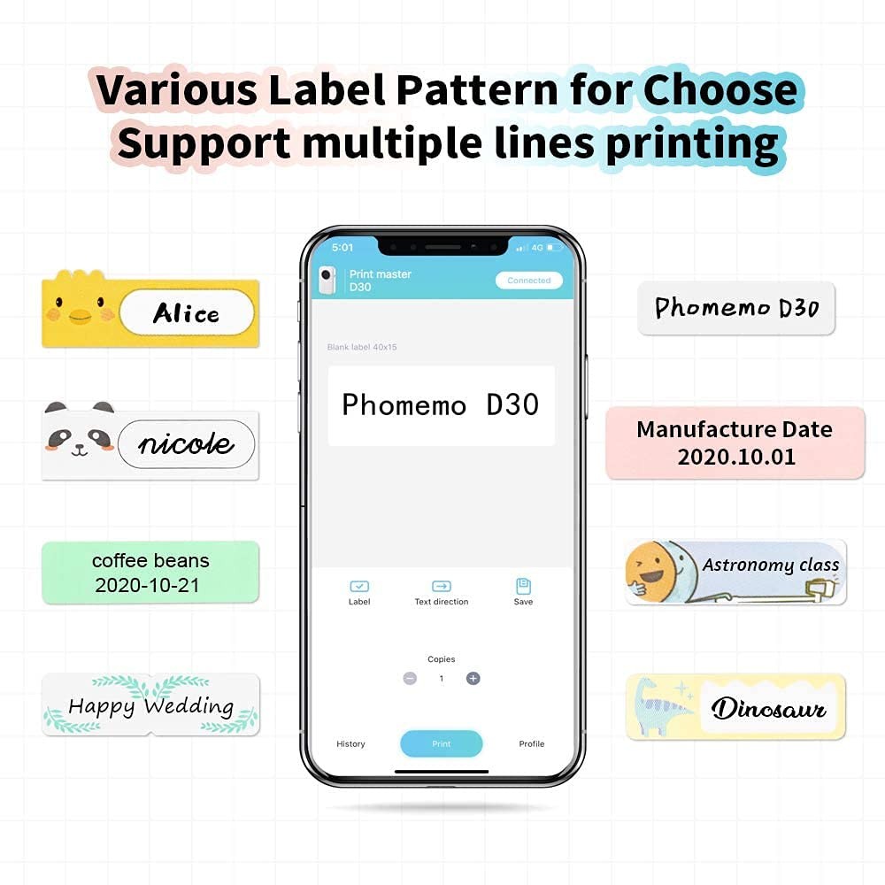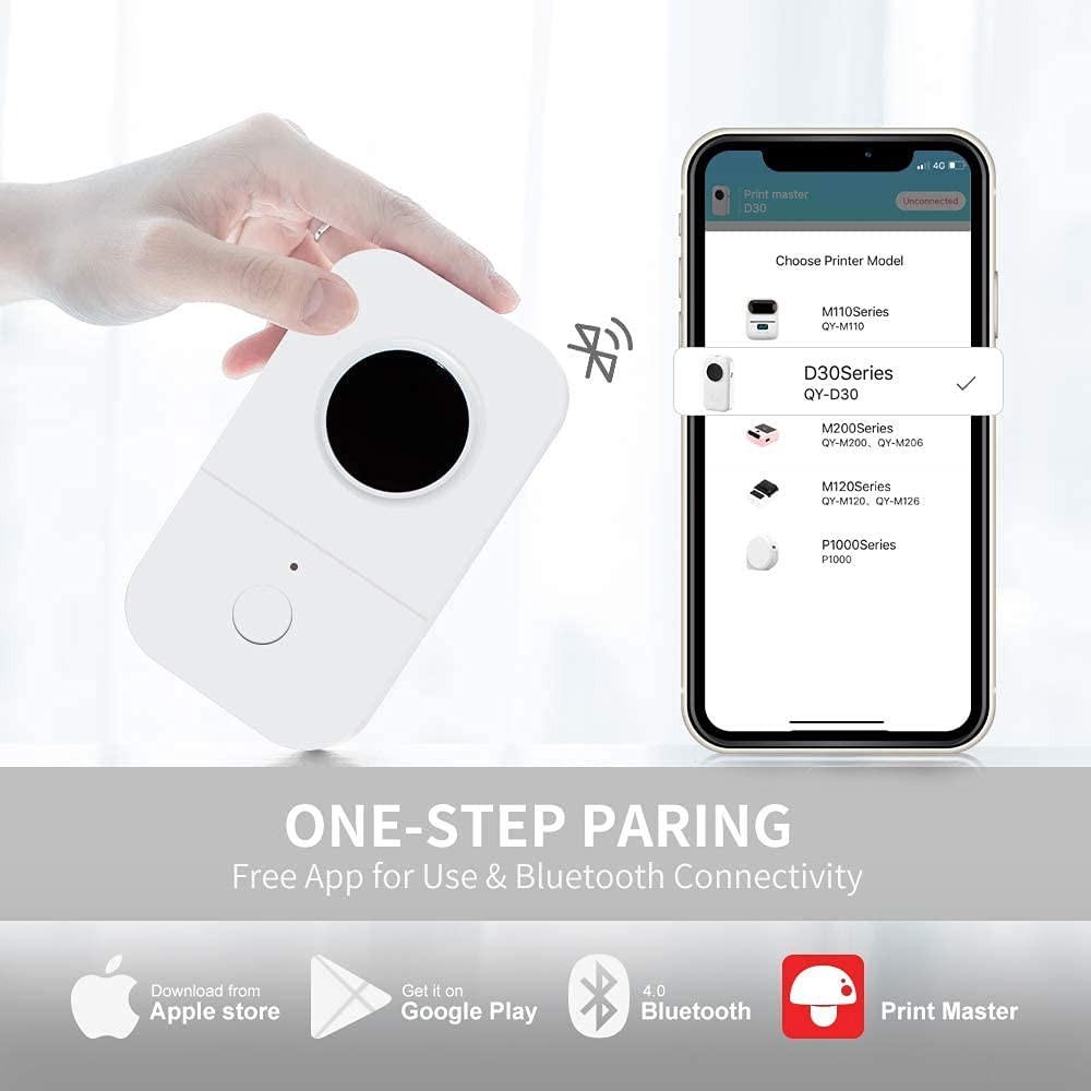 Product Information Printer Output Type: Monochrome Resolution: 203dpi Weight: 0.35 LB/160g Printing Method: Direct Thermal Printing Print Speed: 60mm/s Print Head Life: 50KM Data Transfer: Bluetooth 4.0 Size: 5.2 x 2.3 x 1.2 Inch (131 x 75 x 29 mm) Support System: for IOS 8.0 + Android 4.0 and above Wireless Distance: 10m Battery: Built-in 1200mAh Rechargeable Battery Attention : ★Please insert or pull out the charge cable lightly in case of the any damages on the port. ★ Please pull out the cable after finish the charging. ★Please do not charging or using the printer under the high temperature, high humidity, and foggy circumstance (like in the bathroom, stream room and beside the fire) in case of any dangerous. ★ Improper charging methods may be cause damages to the print head. ★ Please do not touch the print head by your fingers in case of the high temperature. ★ Please pay attention to the sharp blade. Package List: 1* Label Printer 1* Roll Printer Paper 1 * User Manual 1 * USB Cable Please note that: 1.Download the app "printer master" from apple store/google play 2.connect the Bluetooth via "printer master" app, not on the phone system 3.When install the paper, the printing side of the paper is face left 2025 Upgrade Version Label Maker - The portable bluetooth label maker Support continuous label tape and labels in fixed length. It is half weight and size of the traditional label maker. DPI increased 25% for more clear image. Built-in recharge battery long working time. Save Money - Thermal technology - doesn't require ink, toner, or ribbons, Lower cost compared to inkjet printers. Los of thermal color paper for your choice (This label maker is Monochrome Printing Output, which only prints black text. We can create color-label artwork, printing with color-patterned label tapes is required. ) Wireless & Portable - Mini size wireless bluetooth connected label printer for Convenient & Fast printing, Create Labels from Mobile Devices, easy for custom label. High Quality Printing - This Small thermal label printer provides superior print clarity resulting in hassle-free printing- high quality crisp, dark imaging and smooth printing effects and fast processing. Widely Use in Life – D30 handy printer can printer 16 sizes thermal paper, and we also provide you many different color label paper. You can use it in home/office organization.