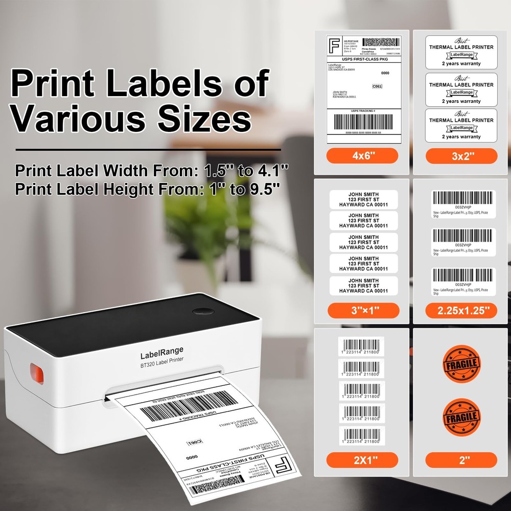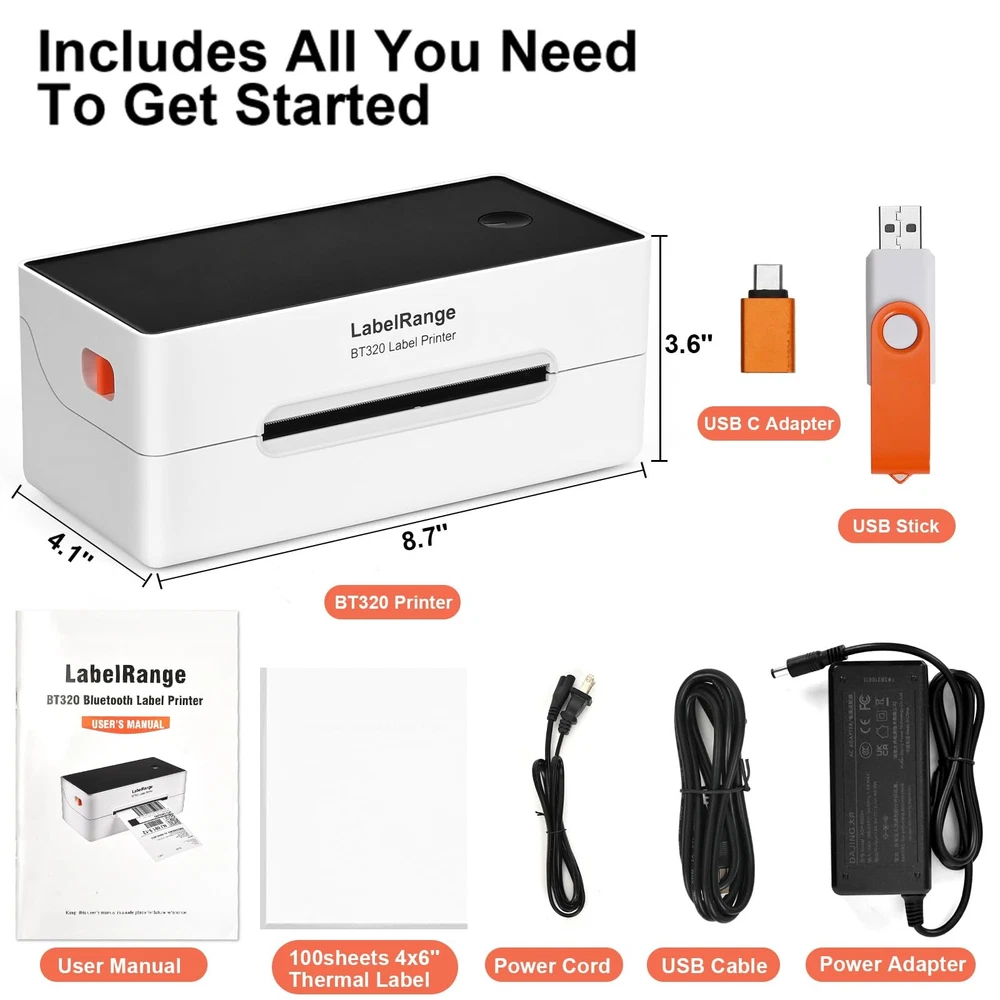 BT320 label printer is a great choice to have at your office or home desk. SIMPLIFY YOUR SHIPPING WORKFLOW: No more Post Office trips. Stop buying ink and toner, thanks to its advanced direct thermal technology that ensures it always prints when needed. Enjoy high-speed printing of 72labels per minute. Achieve clear and visible labels for easy reading and scanning because of our high resolution 203 DPI print head. The labels have an adhesive back so there are no cutting and taping labels on the package. PRINT VIA BLUETOOTH OR USB CABLE: Get the "Rekdom Printer" app from Google Play or Apple Store. The wireless Bluetooth functionality works seamlessly with both iOS and Android phones and tablets when using the "Rekdom Printer" app. For Windows users, you can connect effortlessly via a USB cable and set up Bluetooth printing. However, Mac, Linux, and Chrome OS users can only connect via USB cable, except for Macs with M1, M2, or M3 chips, which can also print via Bluetooth using the app. PRINT LABELS OF VARIOUS SIZES EFFORTLESSLY: Print direct thermal labels ranging from 1.5 to 4.1 inches in width and 1 to 9.5 inches in height. This versatility makes it perfect for various label types, including 4x6'' shipping labels, 3x2'' product labels, 3x1'' address labels, 2x2'' circle labels, 2.25x1.25'' product SKU labels, 2x1'' barcode labels, as well as warehouse, mailing, and multipurpose labels, among many other applications. VERSATILE COMPATIBILITY: This bluetooth shipping label printer can work with all major shipping platforms, including USPS, UPS, Shippo, Pirate Ship, ShipStation, ShipWorks, and selling platforms such as Amazon, eBay, Etsy, Shopify, Poshmark, PayPal, Whatnot, and more. It prints 4x6'' shipping labels. (Note: Most platforms now produce 4x6'' labels directly. Remember to choose the 4x6'' label format before creating your label.) CONFIDENCE: If you liked the LP320 label printer, you'll definitely find the BT320 model even more appealing. is committed to providing 5-star customer service through both phone and email support. In case the printer doesn't meet your expectations, please don't waste your labels. Instead, feel free to contact 's customer service for assistance. We've been providing expert support since 2019, and we appreciate the opportunity to help you. Most problems can be resolved in just 10 minutes. Thank you.