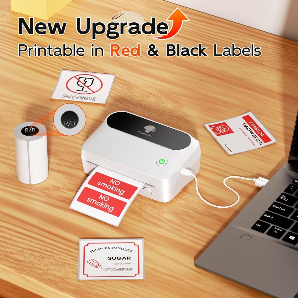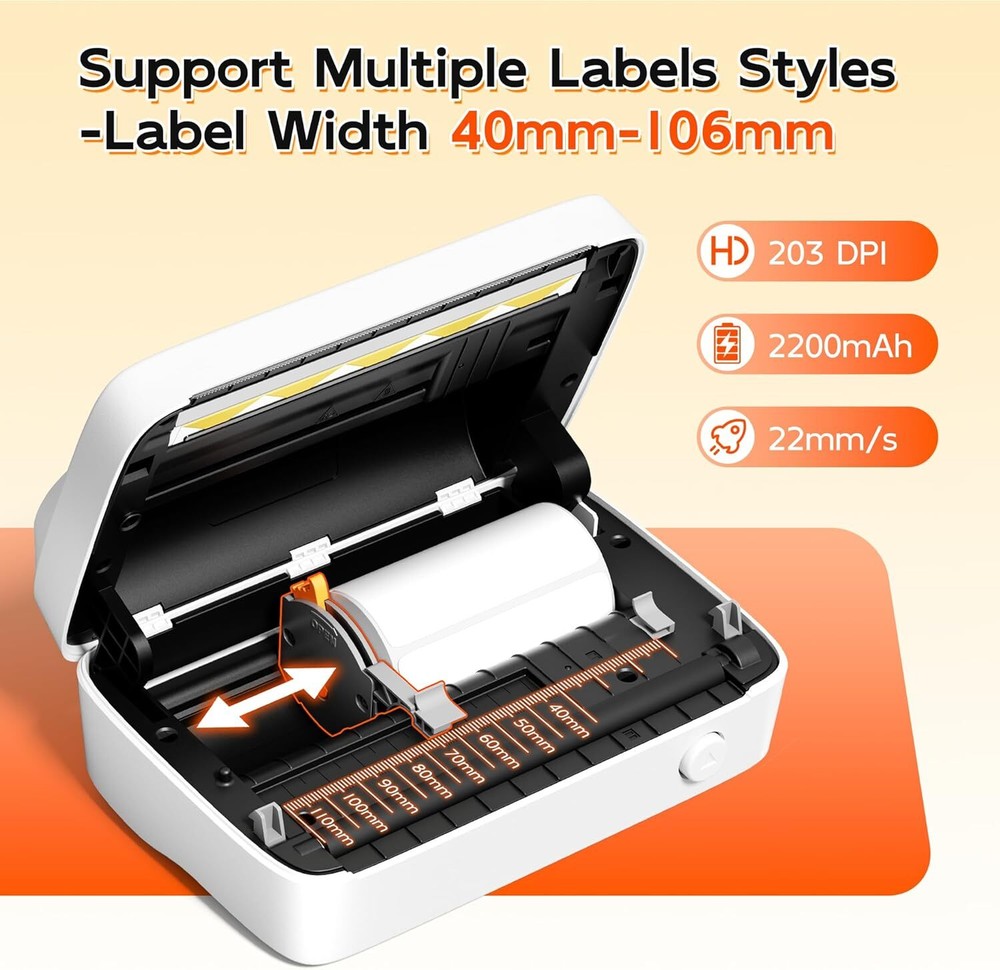 About this item Ultra-Portable & Wireless Thermal Printer - This printer features a compact, slim design with a built-in 2200mAh rechargeable battery, making it a portable label printer perfect for on-the-go use. Seamlessly connect via Bluetooth to mobile devices (Android/iOS) or USB to PCs, ensuring wireless printer flexibility for home, office, or logistics settings. High-Speed 4x6 Shipping Label Printer - Designed for efficiency, this 4x6 shipping label printer delivers professional-grade performance with 203 DPI resolution, ensuring crisp barcodes, QR codes, and addresses. Its thermal technology supports rapid printing for shipping, warehousing, and retail needs, boosting productivity without delays. Inkless & Cost-Effective Thermal Printing - As an inkless printer, it eliminates ink and toner costs using advanced thermal direct technology. Compatible with roll or fanfold labels (1.57"–4" width), it’s ideal for businesses seeking eco-friendly, low-maintenance solutions for shipping labels, inventory tags, and organizational tasks. Multi-Device Bluetooth Label Printer - This Bluetooth label printer works effortlessly across devices: pair wirelessly with smartphones/tablets via the "Print Master" app or connect via USB to PC/ laptop (Compatible with Windows10/11, MacOS, Chrome OS, and Linux systems). Smart Customization - Unlock limitless creativity with the "Print Master" app, offering 1,500+ icons, 110 fonts, and 200+ templates. Print shipping labels, branding logos, or home organization tags in 20 languages. Product dimensions: 2.44"D x 10.31"W x 1.26"H