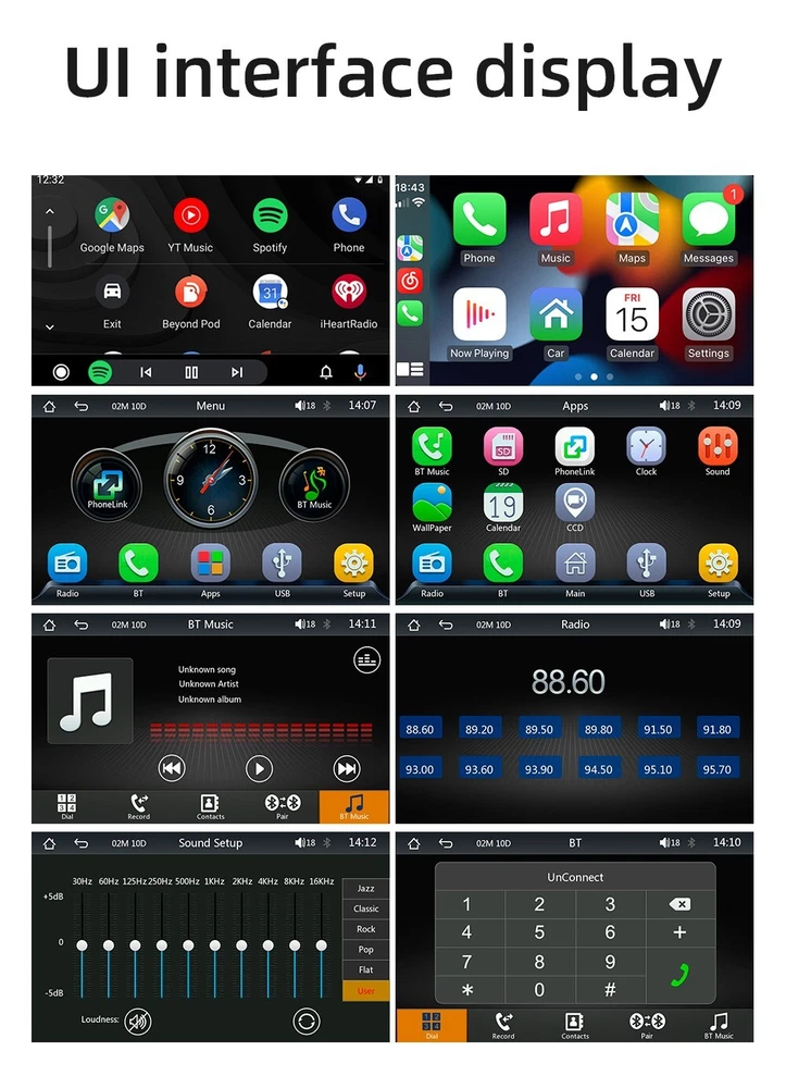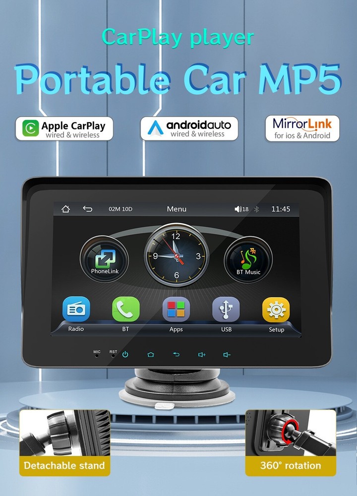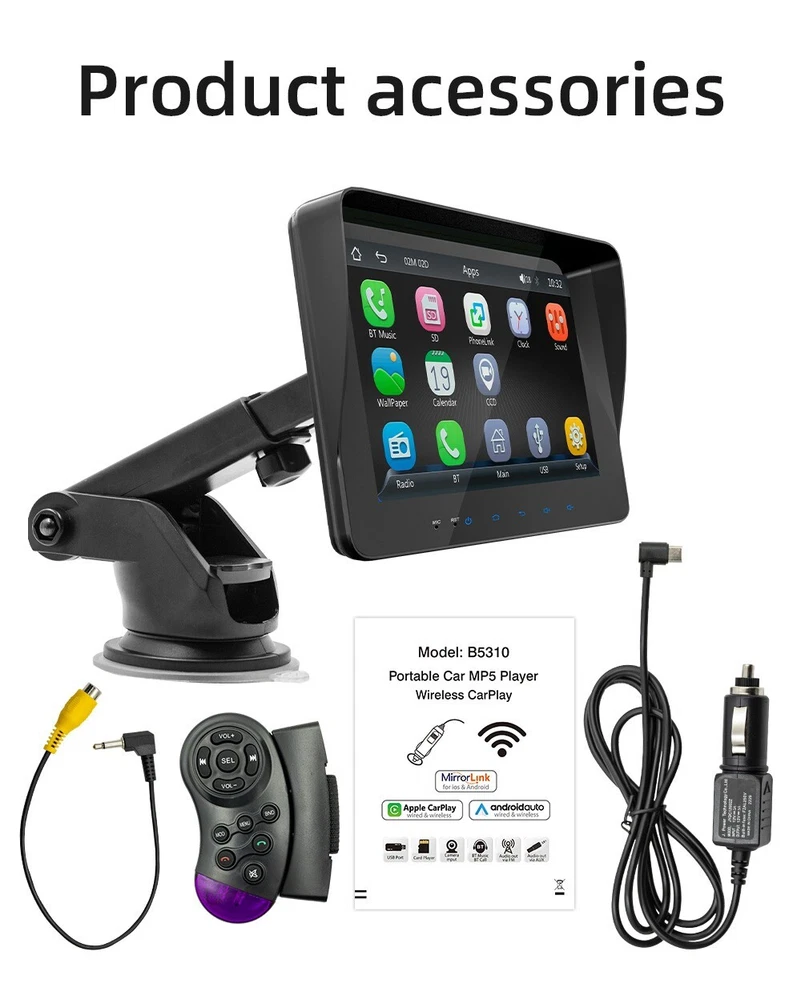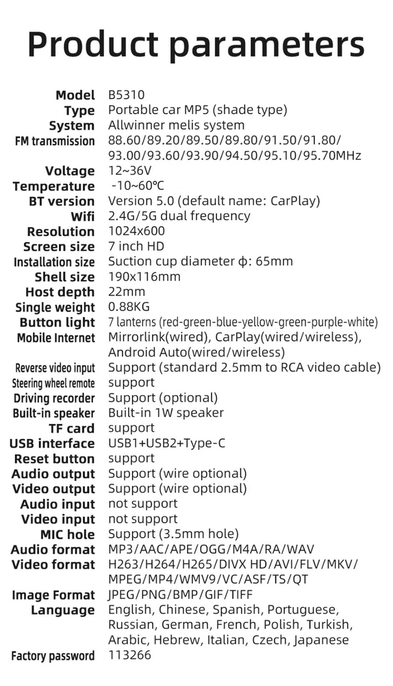 Product Description Universal 7inch Car Radio Multimedia Video Player Touch Screen Portable Wireless Apple CarPlay Android Auto With Steering Wheel Control Add our listing to Watchlist Or Add to Cart , you will get more discount Basic parameters Type:Portable Car MP5 (Sunshade version) System: full log melis system Software solution: F133 Radio transmission frequency: 88.60/89.20/89.50/89.80/91.50/91.80/93/00/93.60/93.90/94.50/95.10/95.70MHz Radio transmission IC: AB5301B Power amplifier IC: CS8571E Output power: built-in 1W speaker Working voltage: 12-36V Working temperature: -10~60 ℃ Bluetooth version: 5.0 (default name: CarPlay) WiFi frequency: 2.4G/5G dual frequency CPU: F133 Running memory: 1Gbit DRAM Display resolution: 1024x600 Screen size: 7 inches high-definition Installation size: 65x65MM Shell size: 190x116MM Host depth: 22MM Functional parameters Mobile internet: support Reverse image: support(camera not included) Play video warning: support Steering wheel remote control: support Video output: support Dash cam: support (optional,not included) Integrated speaker: support Rear USB ①: USB2.0 Rear USB ②: USB2.0 TYPE-C interface: USB2.0 Reset button: support Audio format: MP3/AAC/APE/OGG/M4A/RA/WAV Video format: H263/H264/H265/DIVX HD/AVI/FLV/MKV/MPEG/MP4/WMV9/VC/ASF/TS/QT Image format: JPEG/PNG/BMP/GIF/TIFF Language parameters:English, Chinese, Spanish, Portuguese, Russian, German, French, Polish, Türkiye, Arabic, Hebrew, Italian, Czech, Japanese Accessories 1. Host 2. Instructions 3. Cigarette lighter power cord 4. Suction cup bracket 5. Steering wheel remote control 6. Reverse video cable Basic functions 1. Radio frequency transmission function 2. SD card USB drive (audio/video/pictures) 3. Bluetooth function 4. Wired phone screen projection, wired and wireless Android AUTO/Apple CarPlay 5. Rear view function in reverse (camera optional) 6. Dash cam function (optional for dash cam) 7. Colorful lighting Payment Returns Contact Us Shipping We accept payment by PayPal only ! Payment should be completed within 5 days after buyer places the order,or else an unpaid case will be opened in order to cancel the transaction. If you can not pay in time, please contact us. e-check from PayPal will only be processed once the payment clears. All of the items will be shipped to buyer's EBAY address,please confirm your address on Ebay before you buy.Your order will be usually shipped out the same or next business days once the payment is made and cleared. 30-day Warranty with Exchange for defective, malfunctioned, incorrect or parts-missing items. Please notify us and return the item with all parts and accessories packed and marked "FOR EXCHANGE" within 14 days of receipt. If defective, malfunctioned or parts-missing items are no longer available, a refund may be issued. All returning postage costs will be the responsibility of the buyers under all circumstances. If you encounter any problems about anything, please feel free to contact us and we will do our best to assist you solve the issue. If you are not satisfied in anyway, please feel free to let us know and give us a second chance to correct it before you decide to leave any neutral or negative feedback. Please contact us through eBay link if you have any questions. We will reply you within 24- 48 hours. Please check you spam mail if no response for 48 hours. All items will be checked before packing. All items are new and of high quality. Item will be shipped within 1 business days upon receipt of payment, excluding weekends and public holidays. If to USA,we will ship your order by USPS,it will take about 8-12 working days to you,and you can track it on line. If to other country,we will ship your order by China Post or Singapore Registered Air Mail,it will take about 14-21 working days to you,you aslo can track it on line. Delivery time is about 14-28 business days and it may take up to 8 weeks . Payment We accept payment by PayPal only ! Payment should be completed within 7 days after buyer places the order,or else an unpaid case will be opened in order to cancel the transaction. If you can not pay in time, please contact us. eCHECK from PayPal will only be processed once the payment clears. All of the items will be shipped to buyer's EBAY address,please confirm your address on Ebay before you buy.Your order will be usually shipped out the same or next business days once the payment is made and cleared. Returns 30-day Warranty with Exchange for defective, malfunctioned, incorrect or parts-missing items. Please notify us and return the item with all parts and accessories packed and marked "FOR EXCHANGE" within 14 days of receipt. If defective, malfunctioned or parts-missing items are no longer available, a refund may be issued. All returning postage costs will be the responsibility of the buyers under all circumstances. Contact Us If you encounter any problems about anything, please feel free to contact us and we will do our best to assist you solve the issue. If you are not satisfied in anyway, please feel free to let us know and give us a second chance to correct it before you decide to leave any neutral or negative feedback. Please contact us through eBay link if you have any questions. We will reply you within 24- 48 hours. Please check you spam mail if no response for 48 hours. Shipping All items will be checked before packing. All items are new and of high quality. Item will be shipped within 1 business days upon receipt of payment, excluding weekends and public holidays. If to USA,we will ship your order by USPS,it will take about 7-10 working days to you,and you can track it on line. If to other country,we will ship your order by China Post or Singapore Registered Air Mail,it will take about 14-21 working days to you,you aslo can track it on line. Delivery time is about 14-28 business days and it may take up to 8 weeks . Welcome to our Store ~
