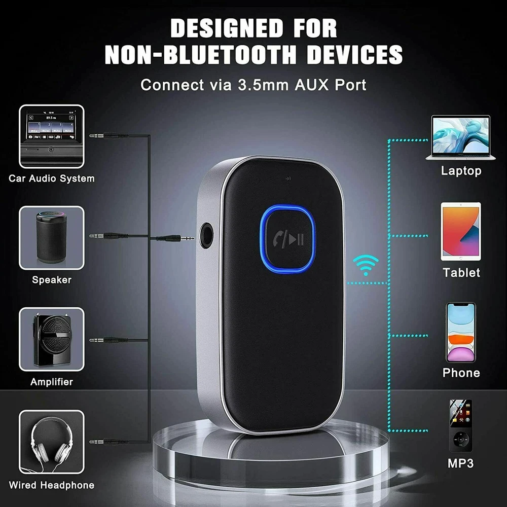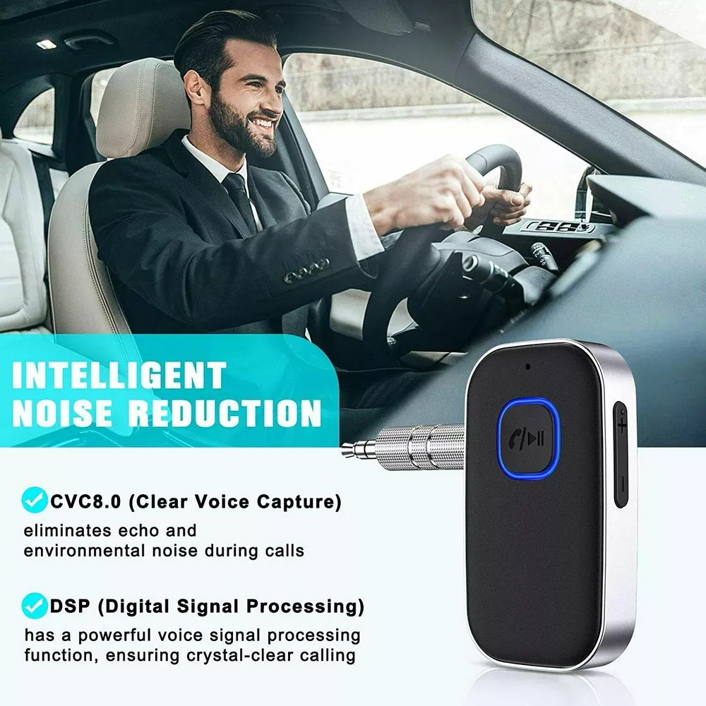 Bluetooth AUX Adapter for Car, Noise Reduction Bluetooth Receiver for Music/Hands-Free Calls, Wireless Audio Receiver for Home Stereo/Speaker, 16H Battery Life/Dual Connect 【Enjoy Wireless Streaming Music】: This car Bluetooth adapter can be connected to non-Bluetooth car audio systems, home stereos, speakers, wired headphones via the 3.5mm AUX adapter; And equipped with a Bluetooth 5.0 chip for stable connection / fast transmission / wide signal range. Just pair it with your phone and start listening to your favorite music! 【Intelligent Noise Reduction Tech】: Our Bluetooth audio receiver adopts the latest CVC8.0 Noise Cancellation and Digital Signal Processor (DSP) technologies, which can eliminate echo and block out intrusive background noise (such as wind, traffic, or crowds), providing you with crystal-clear calling sounds. 【Up to 16 Hours of Battery Life】: The working time of this aux Bluetooth adapter is up to 16 hours when making calls or playing music. And it takes only 2.5 hours to fully charge the device by using a Type-C fast charging cable (Included in the package). In addition, this Bluetooth music adapter can be used while charging, which is very convenient. 【Hands-free Calling & Navigation】: A built-in microphone and one “MFB” button to answer / redial / hang up / reject calls, help you make hands-free calls. And the Bluetooth audio adapter supports broadcasting voice notification from existed navigation App. You don’t have to look down the phone on the move. Make sure you drive safely! 【Dual Connection】: The portable Bluetooth stereo adapter can be paired with 2 devices at the same time. You can enjoy your music and never worry about missing any calls. Once paired, the car receiver will automatically reconnect to your last paired Bluetooth devices, as long as they are within the wireless range. Pairing Steps: 1. Long press the “MFB” button for 3 seconds, the receiver power on and the indicator light flashes red and blue, which means it’s pairing mode. 2. Plug the 3.5mm audio connector into the AUX port on your receiver and the other end into the audio input port on your home stereo or car stereo. 3. Turn on the Bluetooth function of your smart device, search for “J22” and connect. After successful connection, the indicator flashes blue once every 5 seconds. 4. Then you can enjoy music or answer hands-free calls. Easy to Use Universal 3.5mm audio jack design Built-in mic for hands-free calling Multi-function button for Play/Pause and one-touch answering “+”/ “-“ button for volume adjustment and Next/ Previous track Small & Portable Dimension: 2.4in x 1.5in This Bluetooth AUX adapter is small and lightweight, which makes it very easy to carry. You can take it anywhere for enjoying wireless music ! Battery Indicator Once the wireless receiver has successfully paired with the phone, its power will be displayed on the phone to know its usage time. (PS: Most Android phones will display the battery percentage on the Bluetooth connected device interface of the phone.) Package Included: 1 x Bluetooth AUX Car Adapter 1 x 3.5mm Male to Male Connector 1 x 3.5mm AUX Cord 1 x Type-C Charging Cable 1 x User Manual NOTE 1. Charge at least once per 3 months, when not using for a long time NOTE 2. Can't be used for Echo dot How to Pair with The Second Bluetooth Device? 1. Turn off the Bluetooth function of the first smart device, and the receiver will enter pairing mode again. 2. Turn on the Bluetooth of the second wireless device, search for “J22” and connect. 3. Turn on the Bluetooth function of the first smart device, select “J22” in your pairing history. 4. Then both of 2 devices have connected to the receiver at the same time. Tips: When connecting to 2 Bluetooth devices, the default play source is the first one. If you want to switch the playback device, you should pause the current device first, then play the other one.