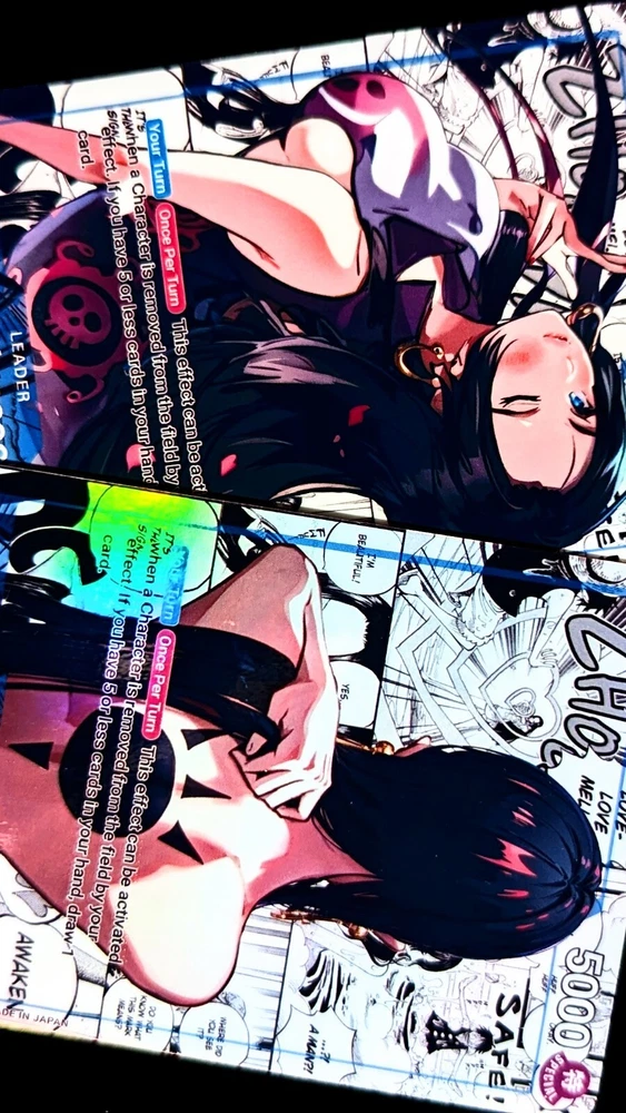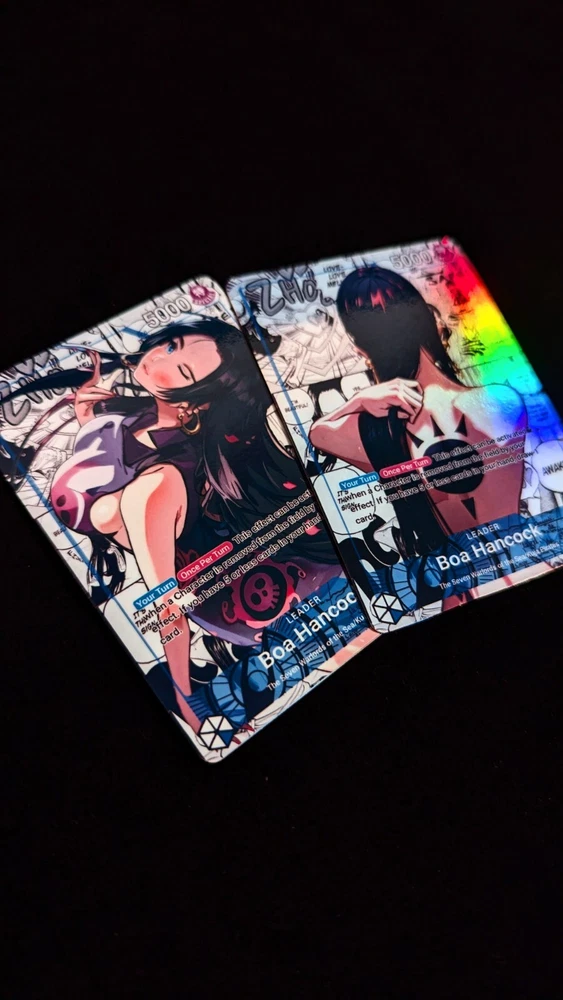 Holographic Foil Boa Hancock Leader Card One Piece Card Game Proxies Set: OP07-038 Variant: Y Card size: Standard (2.5 x 3.5 inches) Materials: Glossy Vinyl, One Piece Playing Card --------------------------------------------------------------------------- Are you a cultured and distinguished gentleman that enjoys waifus? If so, then you are in the right place! Each card is handmade, and made to order. I have experimented and choose the best materials to replicate the quality of the original card. Each card is laminated with protective vinyl (waterproof), and applied on an official One Piece Card Game leader card. I inspected every card before shipping to ensure each card is up to standard. I love each card I create and I hope you do too 💖. View my store for see all the proxies! Please contact me for any questions or concerns. Thank you! --------------------------------------------------------------------------- This is a fan-made custom card that is a parody of the actual card game.