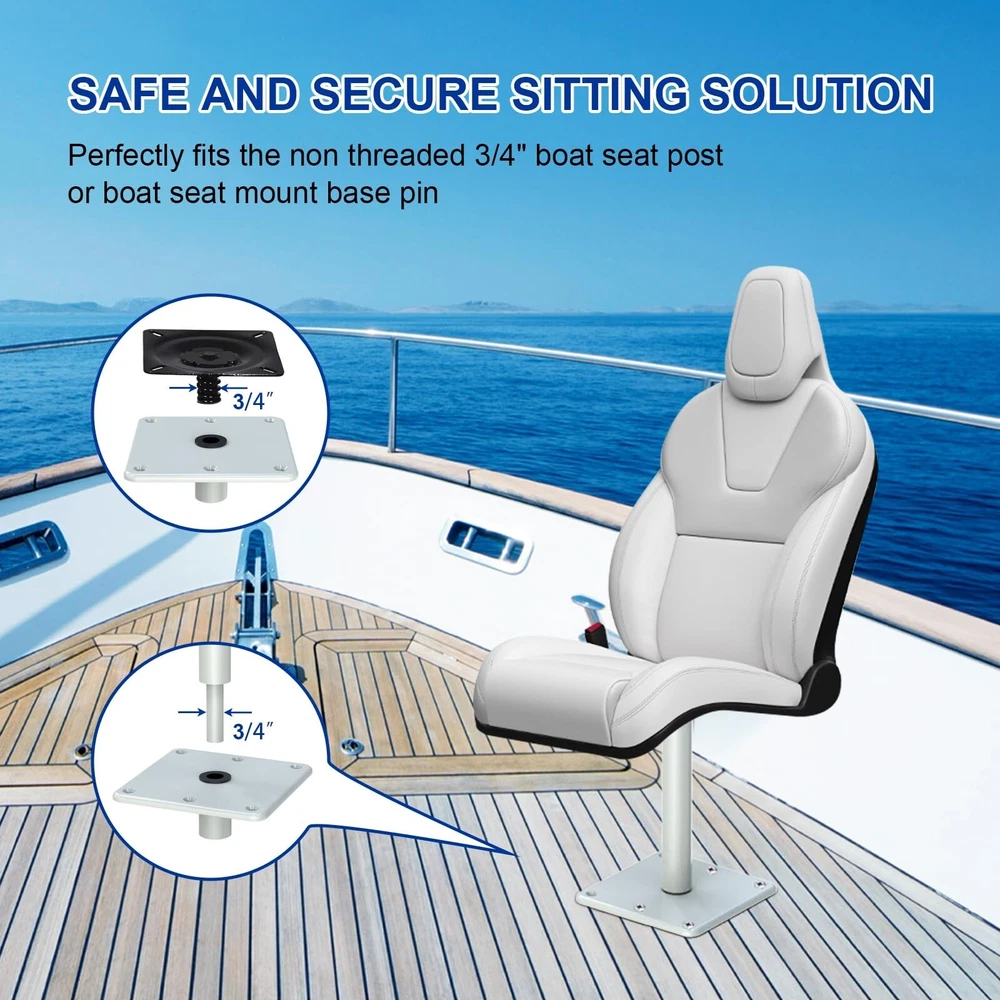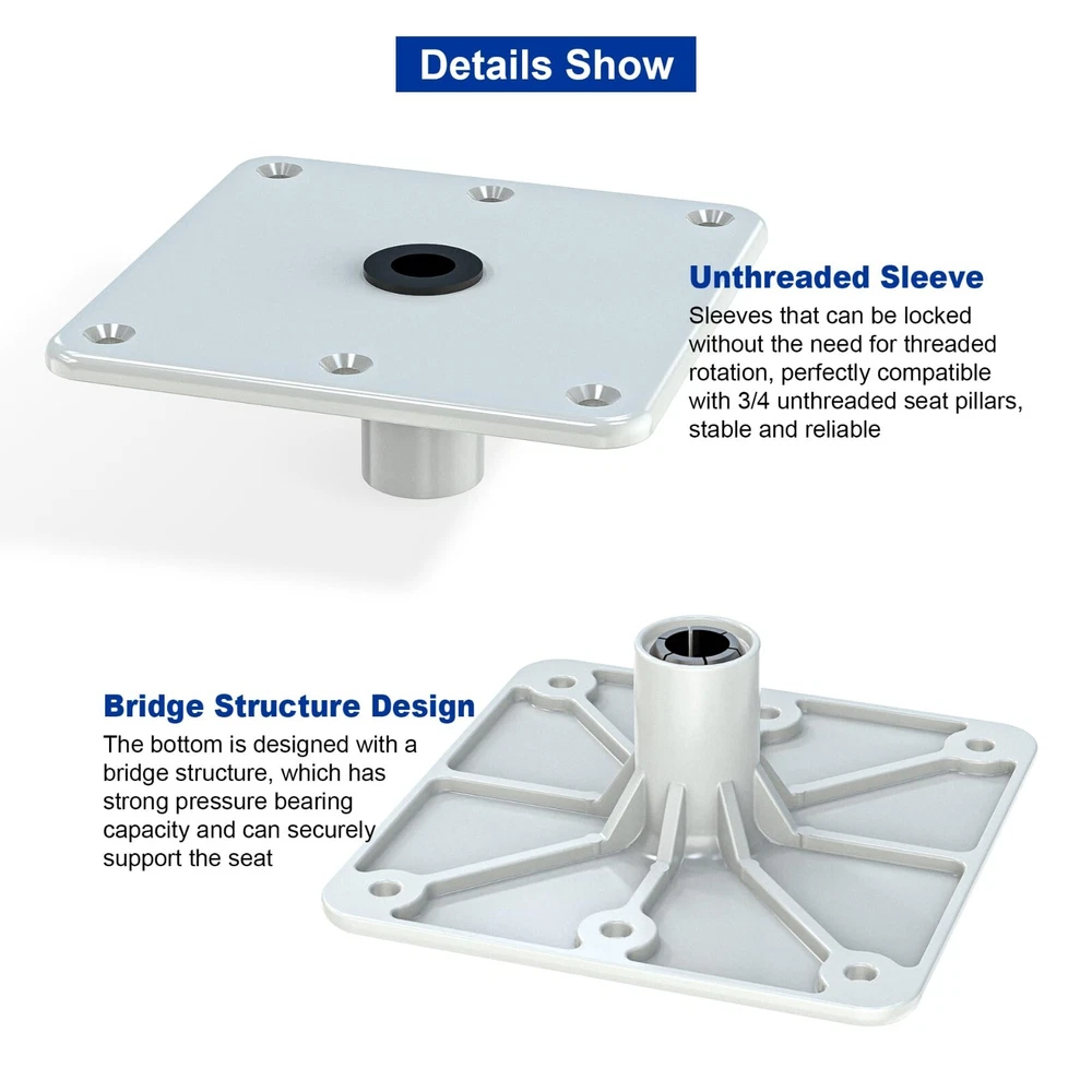 Boat Seat Base,Boat Seat Pedestals 7" x 7" Aluminum Alloy,Seat Base with 3/4" Pin Post Socket,Durable and Sturdy High Quality Forging: Durable and sturdy, the boat seat base, 7" x 7" is forged from high-quality aluminum alloy, boat seat pedestals 7" x 7" aluminum alloy has the advantages of hardness, strong pressure resistance, and corrosion resistance. You can confidently hand over your seat to the boat seat mount Easy to Install: Boat seat base is installed by a relatively simple drilling installation method, you only need to leave space on the deck of the ship for the column connecting the 3/4 inch hole in the middle to be placed, and drill small holes for the surrounding 6 3/8 inch holes and tighten them with screws Precision Structure: The boat seat base mount is exquisitely crafted, with a sleeve located in a 3/4 inch hole that becomes more solid as it is inserted tightly. The bottom of the boat pedestal base is designed with a bridge structure, giving it excellent compressive strength, ensuring that you can sit more comfortably and safely Widely Applicable: If you are a ship enthusiast, this boat seat mounts is perfect for you. The external size of 7 * 7 inches allows you to install this boat base anywhere on the ship. The middle 3/4 inch sleeve is suitable for most ship seats. Using this boat seat base greatly enhances your water experience Optimize Sail Experience: Do you feel bad about the boating experience of water boats swaying? This boat seat base is stable enough to firmly secure your seat. With this boat chair base, you can freely choose comfortable marine seats and enjoy a safe and comfortable water life (Item does not ship to Miami&Doral, FL), have any problem please contact us !