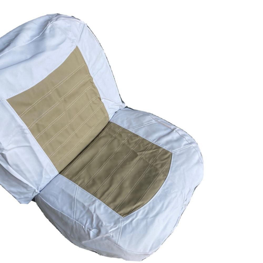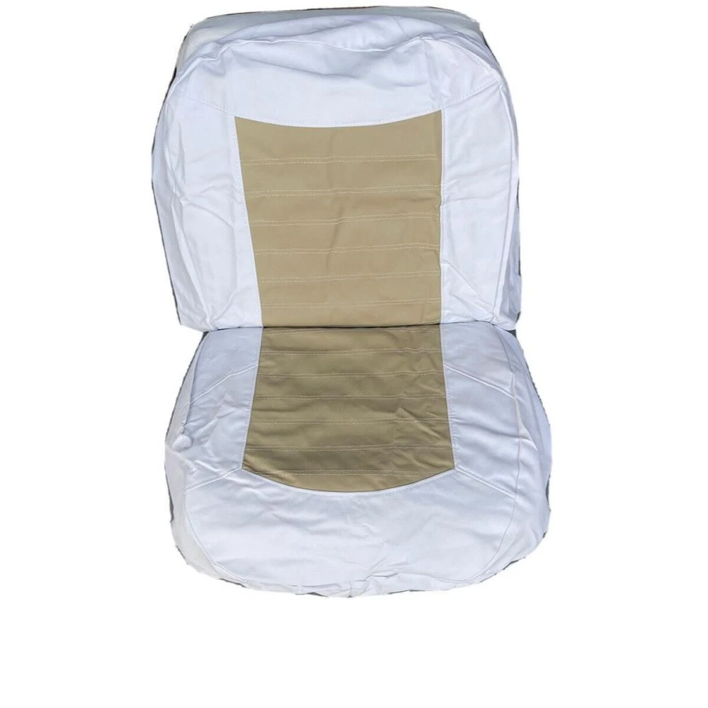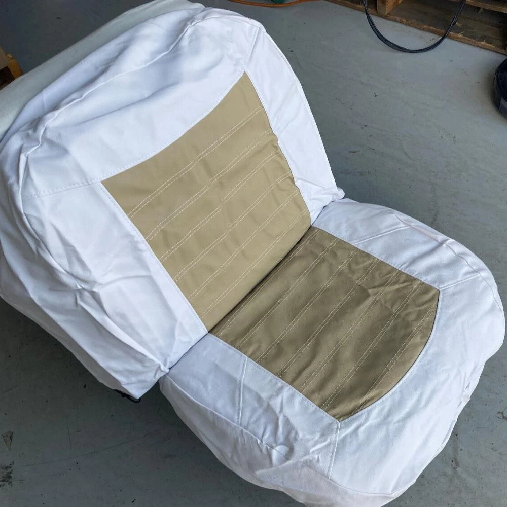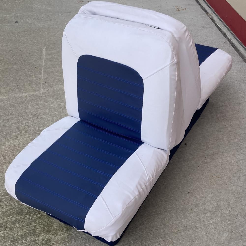 Boat Seat Cover Skin Replacements: White & Blue; White; Beige & White; Red & White Vinyl Upholstery for Marine Back-to-Back Lounge Bench Seats Please make sure the correct color scheme is selected from the drop down before ordering: Select from : Blue & White , Full White , Beige & White , Red & White Seat Covers EASILY COVER OLD BOAT SEATS FAST : Save time by easily sliding these vinyl seat cover skins over the old with the included elastic straps or staple them behind the seat for better results. 2 MARINE SEAT SKIN REPLACEMENTS : Includes a pair of seat cover skins specialty fabricated to fit each boat seat on one lounge set. UNIVERSAL FIT FOR LOUNGE BENCH SEATS & MORE : Designed to replace over old and cracking vinyl from back-to-back lounge type seats. Can also be used for many other seat types by pulling material to fit tightly. SAVE TIME & MONEY WITH SEAT SKIN REPLACEMENTS : Forget spending hundreds to thousands of dollars replacing boat seats at the upholstery shop. Simply slide these skins over to make your boat more comfortable with a better visual look. Ideal Fit: Bottom half covers (19-20" wide x 16-18" depth); Top half (19-20" wide x 18-19" tall). Simply contact us if there are any issues or the boat seat covers don't work for your project. Affordable Boat Seat Skin Replacement Covers Includes 2 seat covers which fits each seat on a lounge bench seat. Easily Revive Old Seats : Now you can easily replace your old and cracking boat seat vinyl with these affordable seat skin covers. Spice Up Old Seats or Use to Protect Your Seats : They can also be used on newer boats for folks that want to preserve their high valued boat seats. These can help protect your boat seats from the sun and ensure a high resell value in the future. Seat skins come with open back design and elastic bands to make installation easier. How to Install Seat Skins : Simply slide over old seats, then choose whether to strap them together with the included elastic bands. Or use the recommended method by using a staplegun to staple the vinyl behind the seats for best fit. Please note, these seat covers are meant to be universal for all different sizes so they may not be a perfect fit. To reduce any loose areas, it is best to pull them tight and use the staplegun method to secure them. Ideal Fit: Bottom half covers (19-20" wide x 16-18" depth); Top half (19-20" wide x 18-19" tall). Seat shown in display is roughly: Bottom half (20" wide x 16" depth); Top half (20" wide x 18.5" tall) On Aug 11, 2025 at 00:55:15 PDT, seller added the following information: