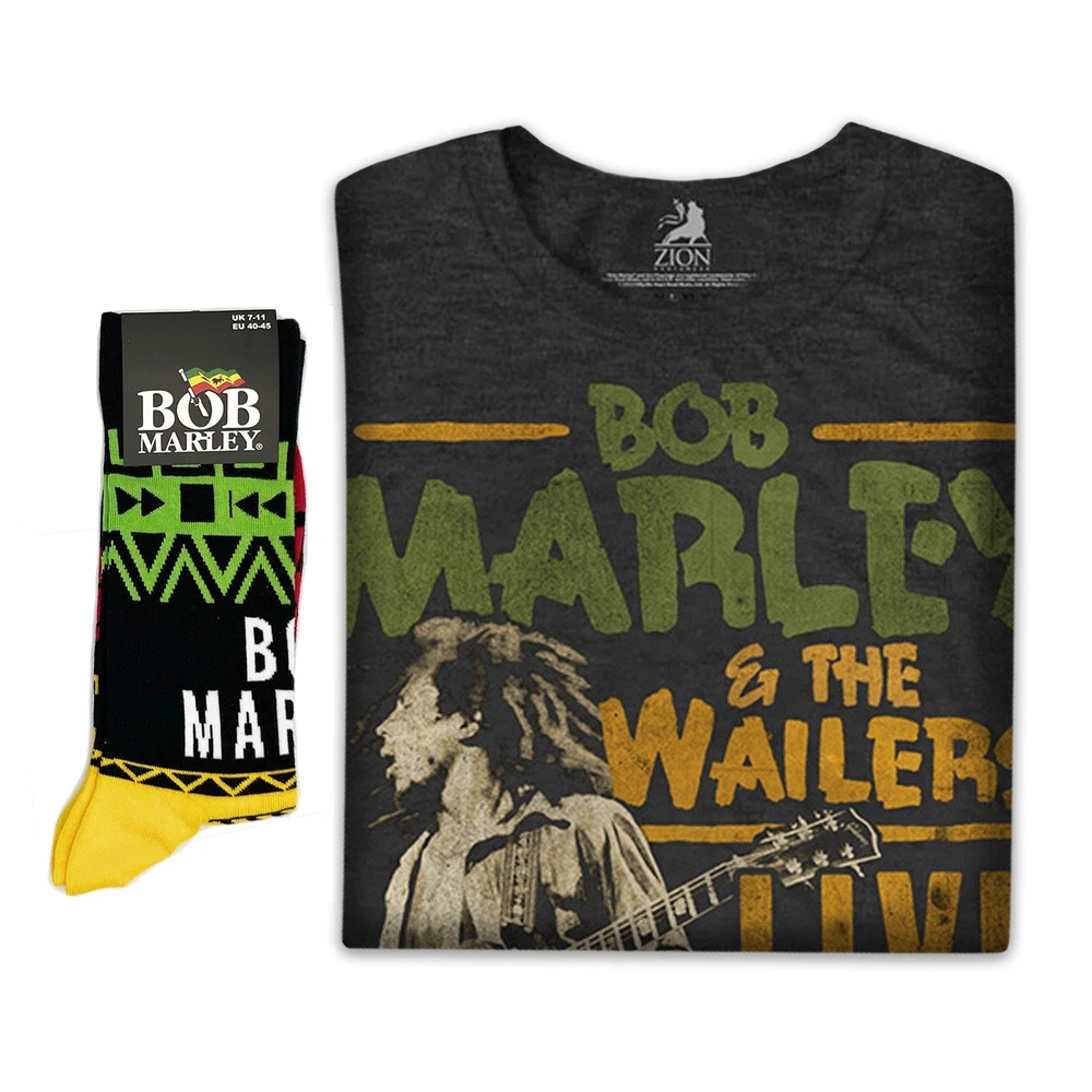 Bob Marley Unisex T-Shirt: Rastaman Vibration Tour 1976 & Socks - Gift set A best selling rock T-shirt with a pair of socks makes the perfect gift for any die-hard music fan. The premium quality, colourful, rich woven socks are made from 86% cotton, 12% Polyamide, 2% elastane and come in size 7-11 (UK), 41-46 (EU), 8-12 (US). The officially licensed t-shirt features a digital screen printed design, short sleeves, crew neck, a soft-style finish and is Cotton. These smart gift sets are limited in number, so be sure to grab yours while you can. Rock Off officially licensed products.