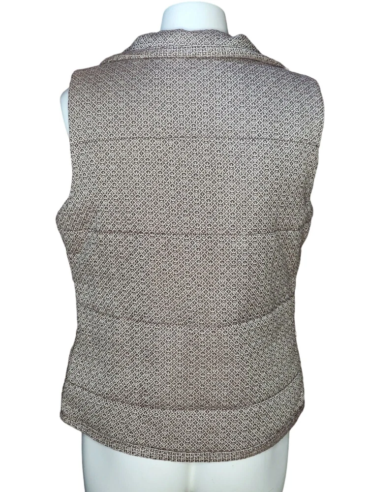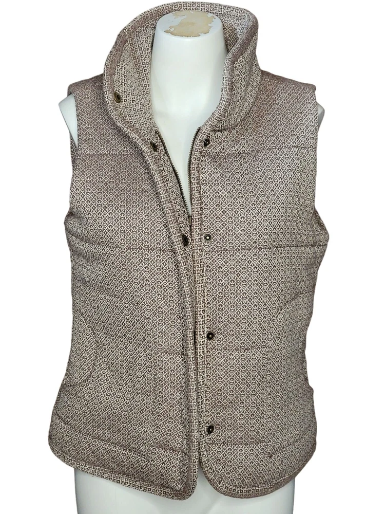 The Bob Timberlake Women's Quilted Vest is the perfect companion for your outdoor adventures. With a snap and zipper-front closure, you can be sure of an easy and secure fit. It's stylish geometric patterns come in handy on breezy days as quilted insulation ensures warmth and comfort. Features: • Sleevless • Hip Pockets • Lined • Shell 60% Cotton 40% Polyester • Quilted, Pockets • Lining 100% Polyester • Padding 100% Polyester Size: Womens Medium Flat Lay Measurements Pit to pit 20 in / 51 cm Length 22 in / 56 cm Condition: Pre-Owned Good Good condition Gently used No rips, stains, tares, or pilling No visible signs of wear Measurements are found in the description Please review all photos and descriptions closely before purchasing. Thank you! Smoke free workspace Please read the description for further details and measurements, Thank you!