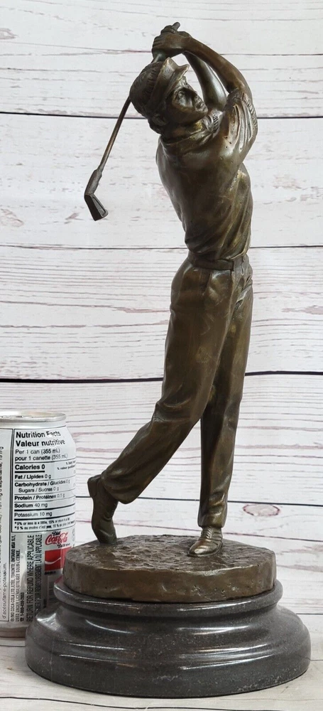 Bobby Jones Golfer Golf Club Collector Sports Memorabilia Bronze Marble Decor Bobby Jones Golfer Golf Club Collector Sports Memorabilia Bronze Marble Decor Condition : This sculpture is in perfect condition Bronze Dimensions with Marble Base: Height 13" X Width 6" Marble Dimensions: Diameter 6" Height without base:12" Weight:9 LBS Inventory:26YRD3954062 Immerse yourself in the world of golf with this captivating bronze sculpture. Depicting a skilled golfer in action, the sculpture captures the intensity and focus of the player as he watches his ball soar through the air. With his head tilted upwards, his eyes track the trajectory of the ball, calculating his next move. His body is poised with precision, reflecting his expertise and dedication to the game. Every detail of the golfer's form and attire is meticulously crafted, from the ripples in his clothes to the texture of the manicured grass beneath his feet. The sculpture is a testament to the artist's skill and attention to detail. Made from 100% bronze, it showcases the beauty and timeless allure of this noble sport. Created using the revered "Lost Wax Method," the sculpture bears the signature of the renowned artist Milo, guaranteeing its authenticity and artistic value. Mounted on a marble base, this sculpture exudes elegance and stability. Whether displayed in a golf enthusiast's collection, a sports-themed room, or as a centerpiece in a golf club, this bronze sculpture captures the spirit and passion of the game. It invites admiration and serves as a reminder of the precision and strategy that golf demands, making it a cherished addition to any space. Golfer Golf Bronze Marble Statue Club Trophy Tournament PGA Art Birthday Gift www.bronzhaus.com Video will open in a new window Using the eBay App? Paste link into a browser window: [isdntekvideo] Shipping Terms : Most of our items are shipped via USPS (United States Postal Service) mail or UPS. Most orders are shipped within 24-48 hours of purchase. Please be aware that not all items are available for USPS shipping due to size and weight. We do ship to Hawaii, Alaska, Canada, Puerto Rico, APO/AE, and U.S. Virgin Islands, however, an additional charge may be required. Please contact us before making any purchases in these areas. For Non-USA customers, you may be responsible for all duty, tax, brokerage fees that may be due upon delivery (shipping costs cover freight charges only). We also ship internationally. Please refer to the "Shipping and Handling" chart for the rates for each area. Payment : We accept just about any form of payment. PayPal, Master Card, Visa or American Express credit cards. Money orders, cashiers checks, and even personal or business checks. For governmental institutions, we will also accept a purchase order. Please understand that for personal or business checks we have to wait for the check to clear (usually 7 days) before shipping. Condition : New Detailed Hand Crafted Hot Cast Bronze Satisfaction Guaranteed. This is Stock Photo, Slight Color Variation!! Listing and template services provided by inkFrog