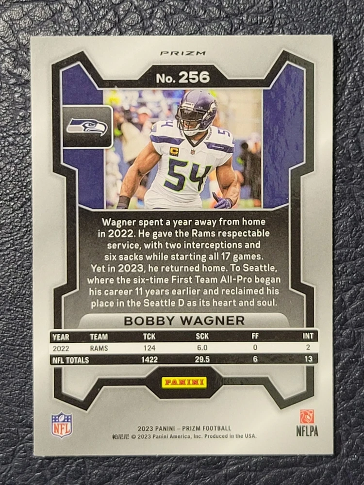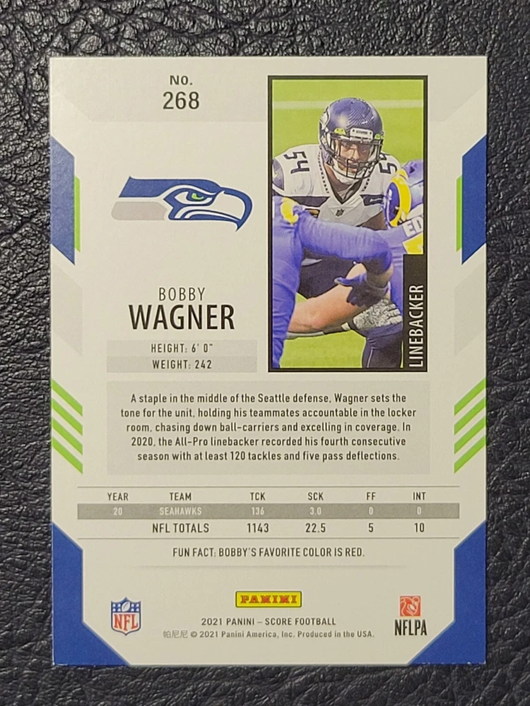 Capture a piece of football history with this set of two trading cards featuring the talented Bobby Wagner. From the 2023 Panini Prizm set, the Orange Disco card sparkles with an eye-catching design, while the 2021 Panini Score Gold card boasts a classic look. Both cards celebrate Wagner's impressive career with the Seattle Seahawks, Los Angeles Rams, and Washington Commanders, as well as his time with the Utah State Aggies in college. Each card is crafted in the United States and showcases standard-size, high-quality card stock. These non-autographed inserts and parallels are must-haves for fans and collectors alike. The cards include English language details and commemorate the exciting Super Bowl event. Add a touch of NFL prestige to your collection with these striking representations of Bobby Wagner's athletic prowess.