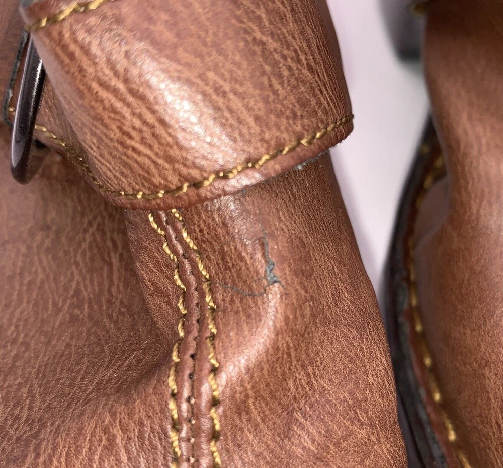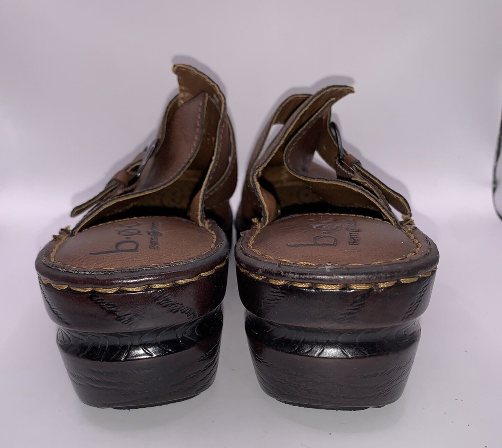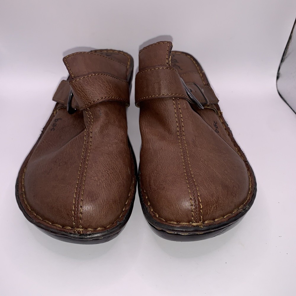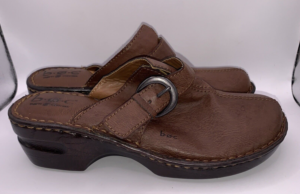 These are Boc Born women's brown leather slip-on shoes in size 8. They feature a round toe, a wedge heel, a strap with a buckle accent, and the Børn logo. The shoes provide arch support and cushioning for comfort and are designed with a nature-inspired, classic theme. Ideal for casual occasions, these slip-on shoes are both stylish and practical.CONDITION CAN BE SEEN IN PHOTOS. PLEASE LOOK AT ALL PHOTOS AS THERE IS A TEAR IN THE TOP OF ONE SHOE AS SEN IN PHOTOS
