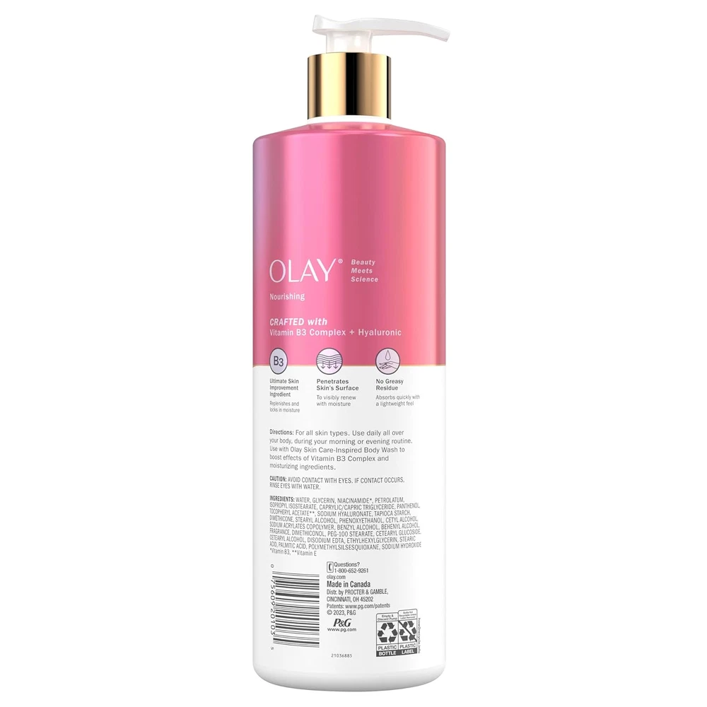 24HR MOISTURIZING: This body lotion provides continuous hydration, ensuring your skin stays soft and nourished throughout the day. EXPERTLY CRAFTED WITH HYALURONIC ACID: This body lotion helps to lock in moisture with skin-quenching ingredients made for all skin types FAST ABSORBING FORMULA: The lightweight formula of this body lotion absorbs quickly and penetrates deeply into the skin's surface, delivering hydration to increase surface cell turnover without a greasy feel. VISIBLY IMPROVES SKIN: The powerful Vitamin B3 Complex in the body lotion hydrates your skin allowing it to retain its own moisture—think of it as the ultimate skin-moisturization ingredient that leaves you with softer, smoother-feeling skin IDEAL FOR DAILY USE: This body lotion is perfect for everyday application, making it easy to incorporate into your skincare routine. USE TOGETHER: Use with Olay Skin Care-Inspired Body Wash to boost effects of Vitamin B3 Complex and moisturizing ingredients Replenish your skin with the Olay Nourishing & Hydrating Body Lotion, an exceptional formula designed to provide 24-hour moisturizing benefits for all skin types. This powerful body lotion is crafted with hyaluronic acid, Vitamin E, and Vitamin B3 complex, working together to deeply hydrate, nourish, and improve your skin’s overall texture. The Vitamin B3 Complex in the lotion is the ultimate skin-moisturization ingredient that allows your skin to hold on to water so it can become its own moisturizer. It also leaves you with visibly transformed skin that looks younger, feels softer, and looks smoother. The fast-absorbing formula of the Olay Nourishing & Hydrating Body Lotion penetrates deeply into the skin’s surface, leaving your skin with long-lasting smoothness and increased surface cell turnove without any greasy residue, making it perfect for daily use. Embrace the beauty of well-hydrated skin and enjoy the long-lasting benefits of this luxurious body lotion. Use with Olay Skin Care-Inspired Body Wash to boost effects of Vitamin B3 Complex and moisturizing ingredients.