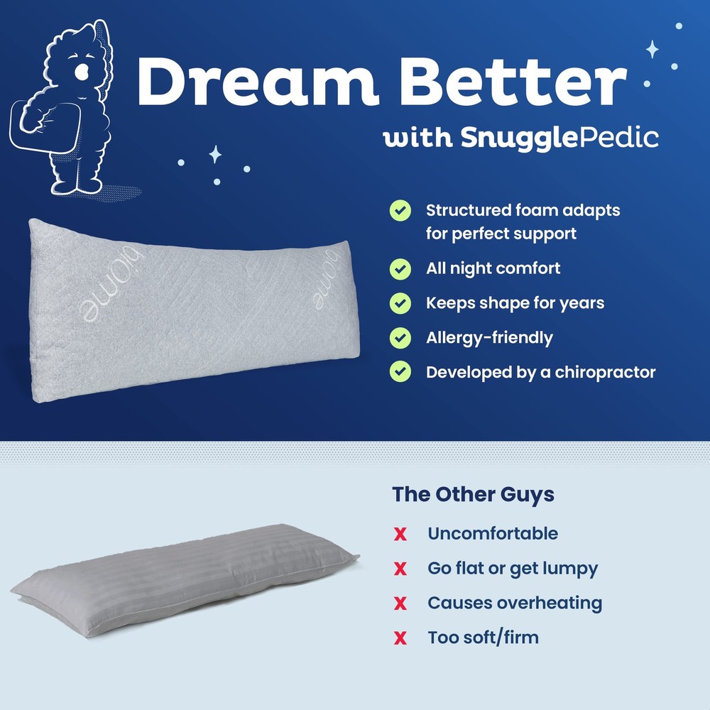 Experience unmatched comfort with this premium pregnancy body pillow, thoughtfully designed to support your entire body through every stage of pregnancy and beyond. Whether in your first trimester or recovering postpartum, this full body pillow offers soft yet firm support for your belly, back, hips, and legs to reduce aches and improve sleep. Made with breathable, cooling materials, it helps prevent night sweats and overheating, while shredded memory foam contours to your shape for spinal alignment and pressure relief. Ideal for side sleepers, this sleeping pillow also works as a cuddle pillow, leg pillow, or back pillow for lounging, resting, or recovery. It includes a removable 20x54 inch body pillow cover with a zipper for easy cleaning, blending seamlessly with queen or king bedding, white or black pillows, and modern bed pillow positioners. Perfect for maternity support, post-surgery recovery, or everyday relaxation, it’s more than a pregnancy pillow—it’s your daily rest essential. This versatile long pillow works for adults, kids, and anyone needing ergonomic comfort. Use it as a headboard pillow, bolster pillow, or side pillow for improved posture and alignment. Pair with your favorite body pillow case or pillow headboard for a cozy, stylish sleep setup. WAKE UP REFRESHED AND RESTED: Designed to cradle your entire body, this pillow helps reduce tossing, turning, and pressure points—so you fall asleep faster and stay asleep longer. Perfect for side sleepers or anyone seeking deep, uninterrupted rest every night. STAY COOL AND COMFORTABLE: Say goodbye to night sweats. The breathable, cooling cover helps regulate your temperature throughout the night, making this the perfect companion for warm sleepers looking for a cooler, more restful sleep environment. PERSONALIZED COMFORT THAT ADAPTS TO YOU: Shredded memory foam contours to your body’s natural curves, providing soft yet supportive alignment from head to toe. Whether you're pregnant or just need full-body comfort, this pillow adjusts to your sleep needs. YOUR NIGHTLY RITUAL, REIMAGINED: More than just a body pillow, this is your new bedtime essential—whether you're reading, unwinding, or sleeping. Its cozy support makes every moment in bed more comfortable, helping you relax into a peaceful night. LONG-LASTING COMFORT AND SUPPORT: Made in the USA with premium materials, this hypoallergenic body pillow is built to hold its shape and deliver consistent support. Enjoy years of restful nights with a pillow that’s easy to love and made to last.