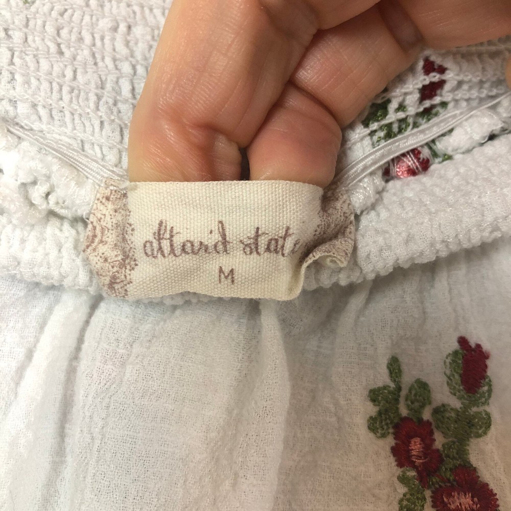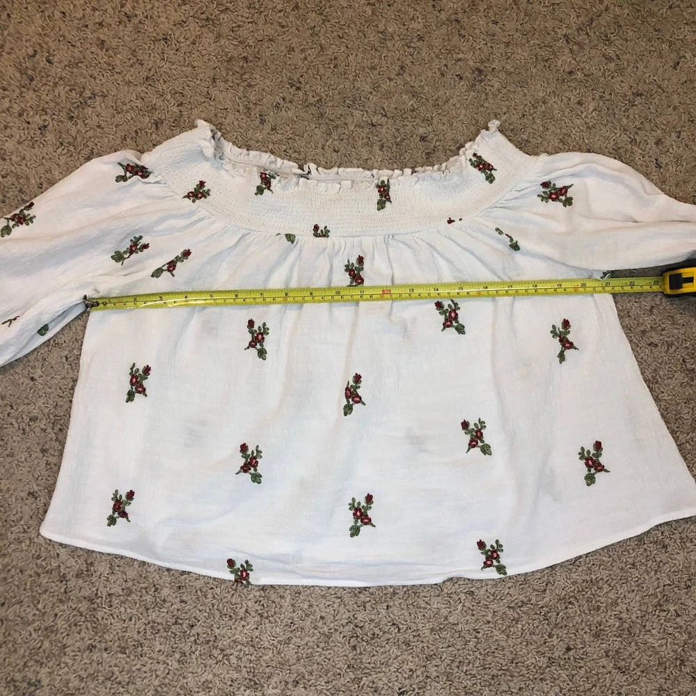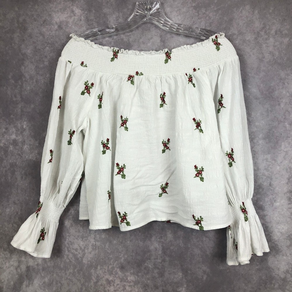 Altar’d State Top Boho Floral Embroidered Off Shoulder Peasant Blouse Cropped Size Medium Smocked neckline 100% Cotton 3/4 length flared sleeves Very good pre-owned condition. Measures approximately: 21" armpit-armpit 16" length (X)