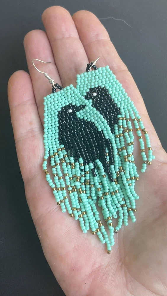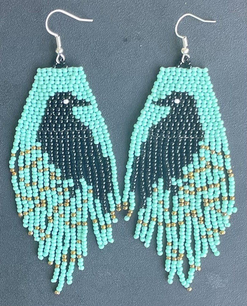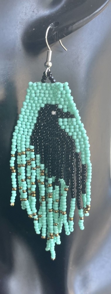 1 pair of long black bird and turquoise seed bead earrings. You will receive earrings pictured. The earrings are made with seed beads. The earrings are approximately 4" long with the ear hooks included. They are for pierced ears. 0-ea-seed-111-1