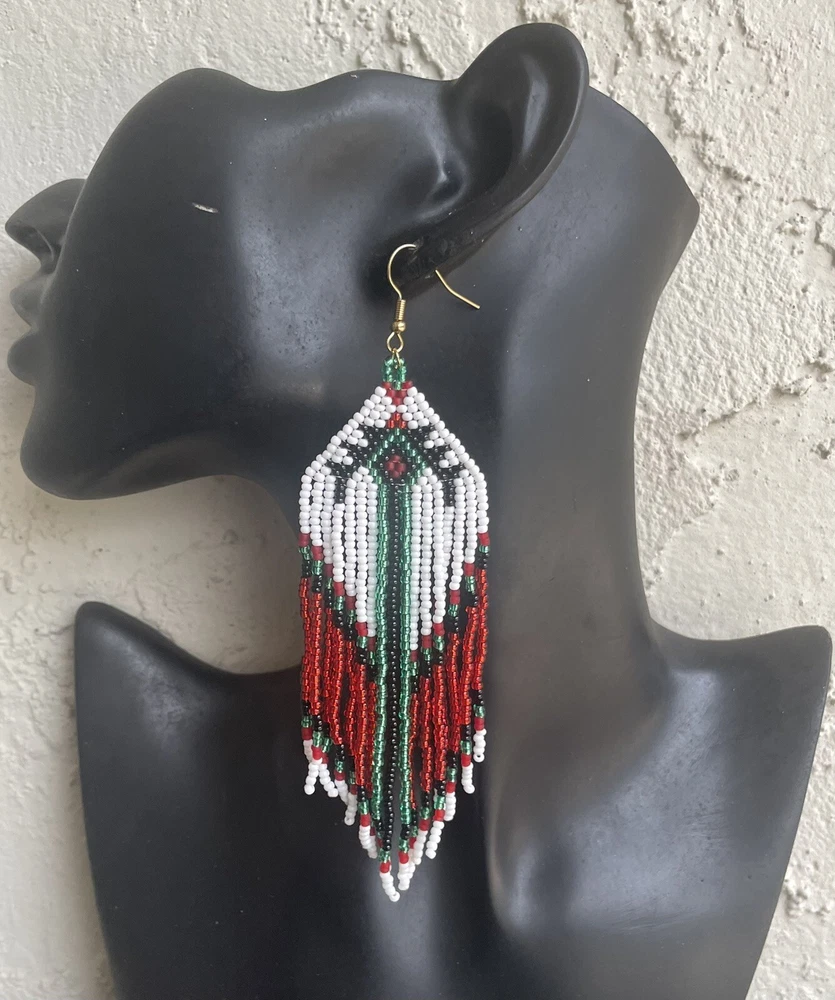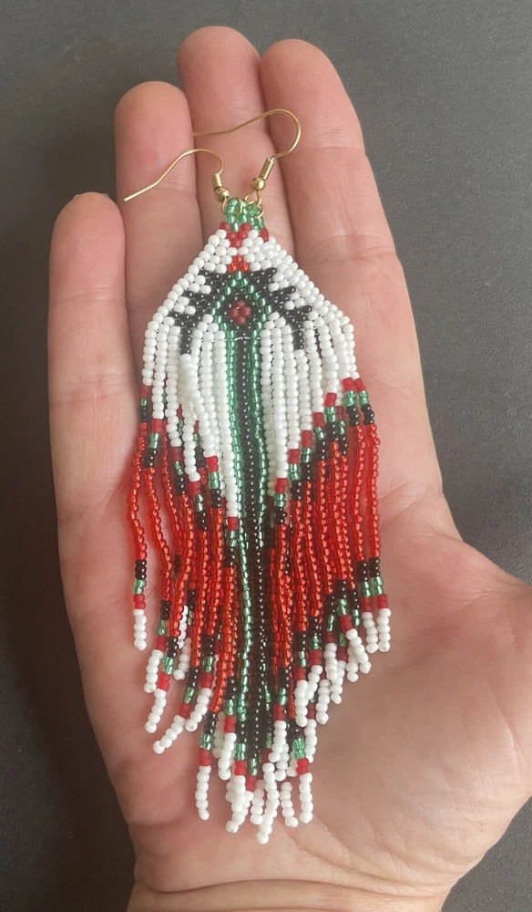 1 pair of long white, green and red seed bead beaded earrings. You will receive earrings pictured. The earrings are made with seed beads. The earrings are approximately 5 1/2" long with the ear hooks included. They are for pierced ears. 0-ea-seed-099-1