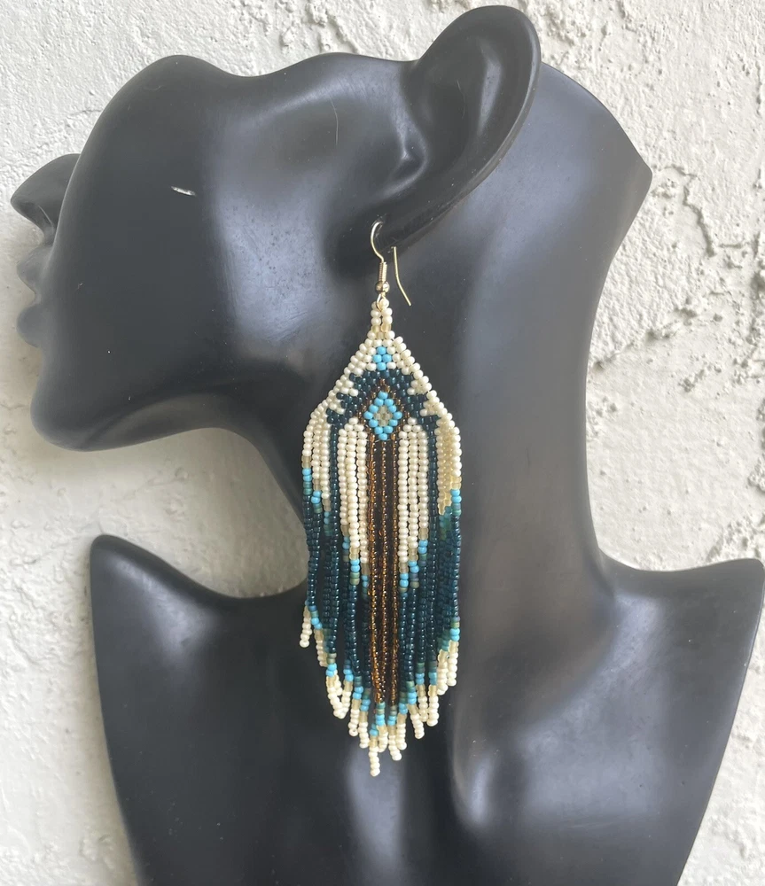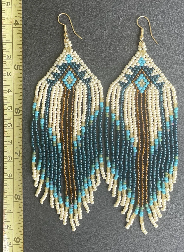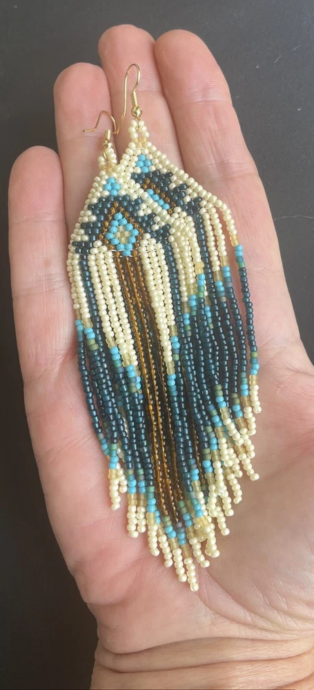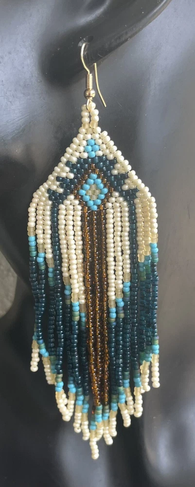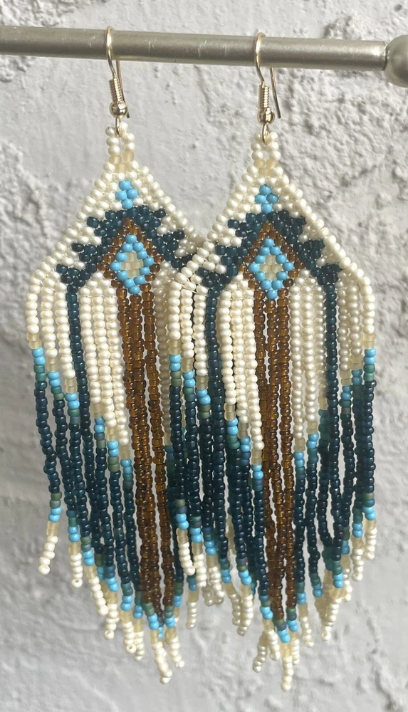 1 pair of long cream, brown and blue seed bead beaded earrings. You will receive earrings pictured. The earrings are made with seed beads. The earrings are approximately 5" long with the ear hooks included. They are for pierced ears. 0-ea-seed4-1