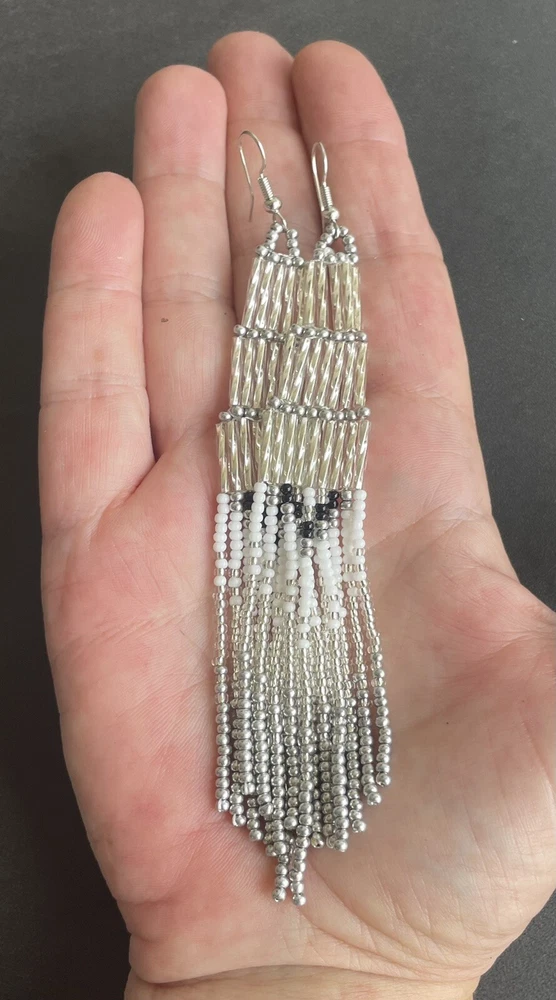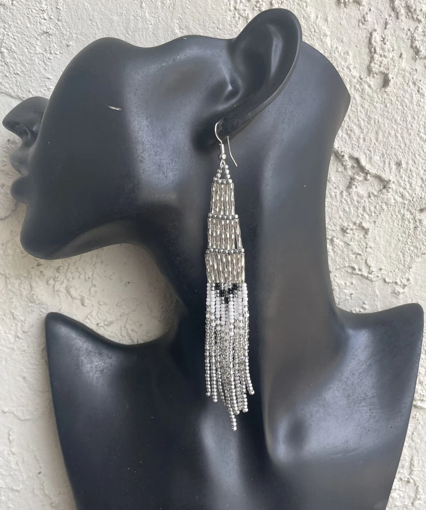 1 pair of long silver and white with black long seed bead beaded earrings. You will receive earrings pictured. The earrings are handmade with seed beads. The earrings are approximately 5" long with the ear hooks included. They are for pierced ears. 0-ea-seed-024-1