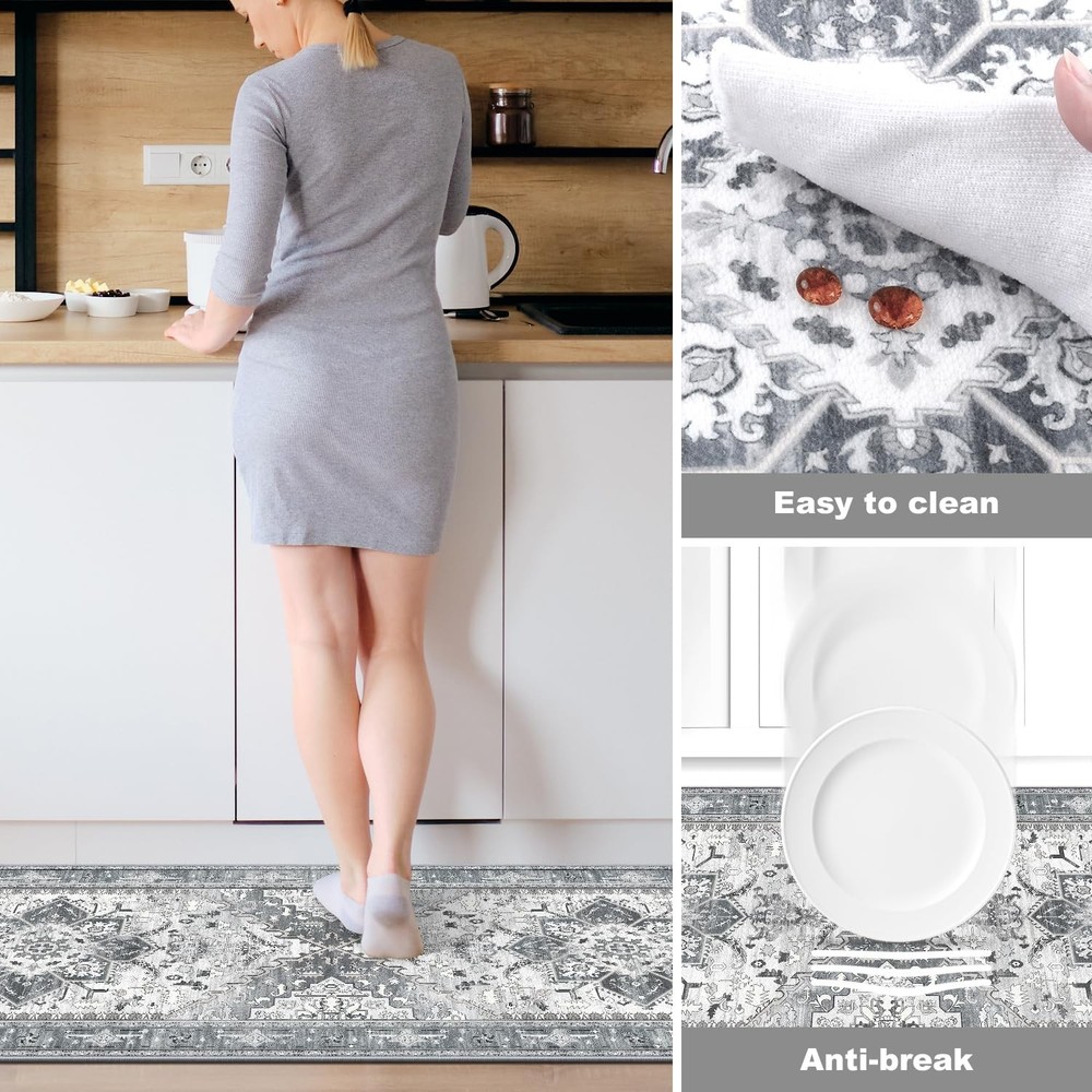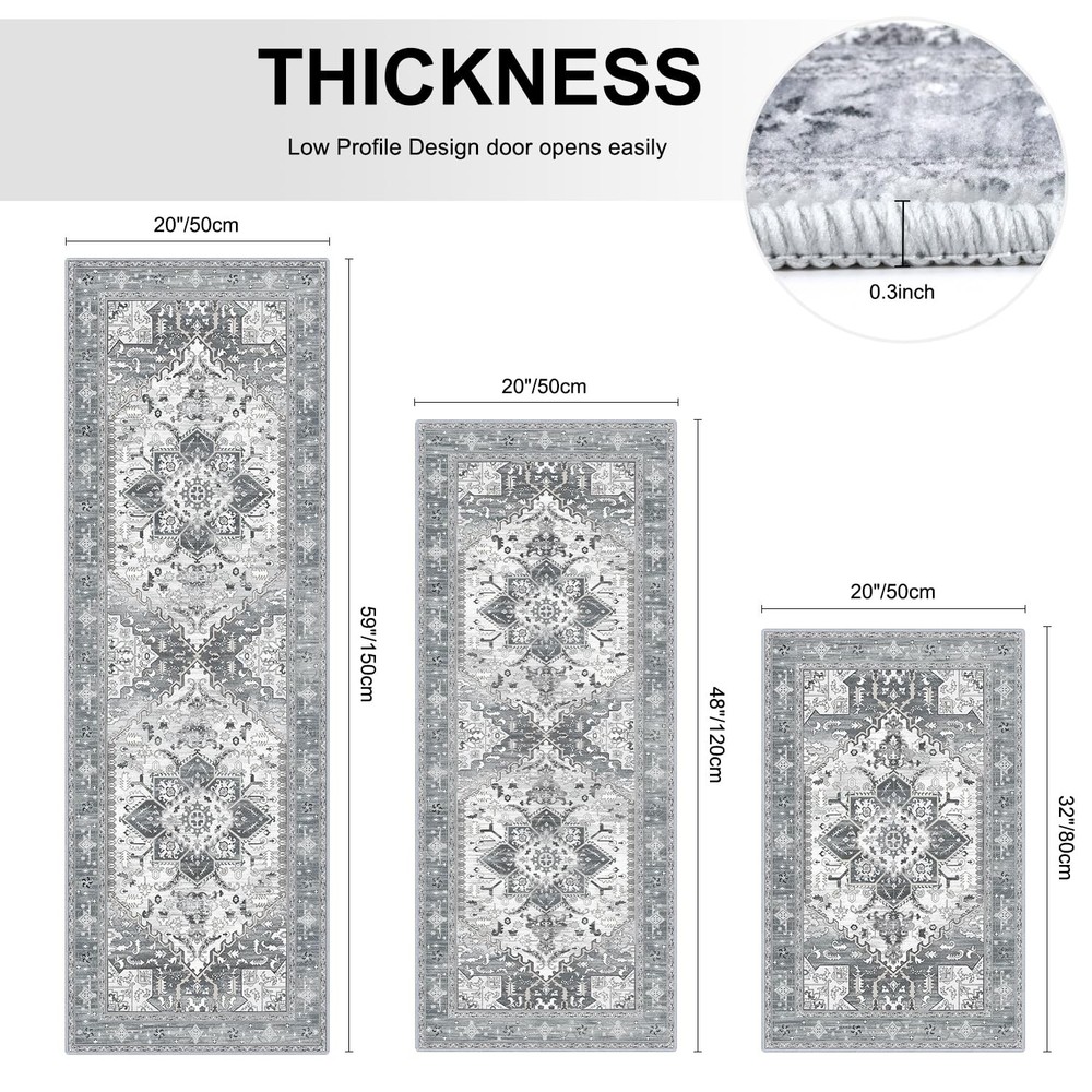 Boho Kitchen Rugs Sets of 3 【Kitchen Runner Rugs Sets 3 Pieces】Boho kitchen rugs measure 20 "x32"+20 "x47"+20 "x59", which can perfectly match your home's decoration style. This vintage runner has elements of boho and traditional to give an elegant look to your home 【Non-Slip Kitchen Rug】The boho kitchen floor mat set are made of high-quality polyester that provide an incredibly soft and plush surface to walk on. Our Kitchen rug has TPR rubber backing against slipping or tripping which can place firmly and securely 【Machine Washable Rug】The kitchen runner is stain resistant and easy to clean. Spills can be easily wiped off and vacuuming for daily cleaning. Washing machine is also available for a deeper clean. Wash in cold water and do not add bleach 【Durable & Low Pile Rug】 The kitchen rugs are crafted from polyester fabrics that resist wear and tear. The reinforced overlock edges make it more durable. With 0.3'' thickness, that is convenient for placement in entryways and will not obstruct doorways 【Widely Use】 bohemian kitchen mat set of 3 can be used in front of sink to do cleaning or prepping meals. In addition, this washable runner rug can also be used in the hallway, laundry room, or even as a stylish accent in your living area