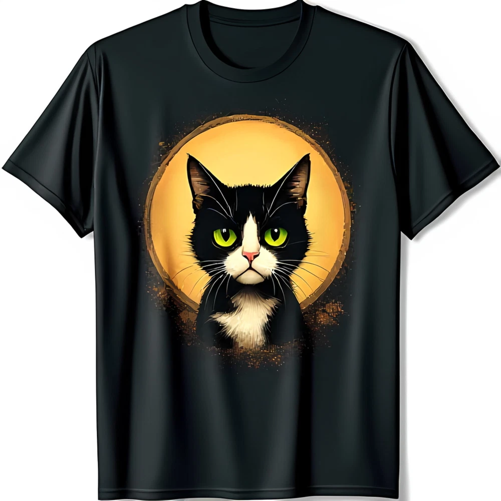 Bold Black T-Shirt with Enigmatic Black & White Cat Graphic Eye Catching Design