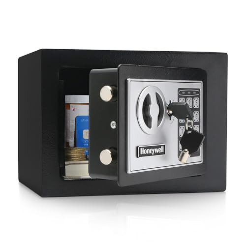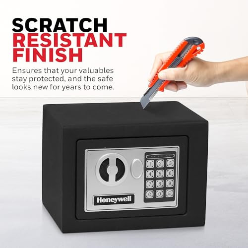 Product Description Safeguard your valuables with the Honeywell Bolt Down Small Safe Box with Digital Lock, a compact yet robust solution designed to keep your prized possessions secure. Whether you need to protect important documents, electronics, or personal items, this steel security safe offers reliable protection with a touch of style. Solid Steel Construction: Built with a solid steel cabinet and door design, this security safe is crafted to withstand tampering and unauthorized access, ensuring your valuables are always secure. Programmable Digital Lock: The digital lock allows you to set your own personalized code, providing quick and easy access while enhancing security. In case of emergencies, the safe also includes two override keys. Scratch-Resistant Finish: The white powder coat finish not only gives the safe a sleek look but also protects it from scratches, keeping it looking new for years. Carpeted Interior: Inside, the safe features a carpeted floor, preventing your valuables from getting scratched or damaged. Pre-Drilled Mounting Holes: For added security, this safe comes with pre-drilled mounting holes and all necessary hardware, making it easy to bolt down to a structure. Ensure your peace of mind with the Honeywell Bolt Down Small Safe Box with Digital Lock. Whether you need a reliable safe for your dorm room, office, or home, this stylish and secure box is the perfect solution. Protect your valuables with confidence and ease, knowing they are securely stored in a trusted Honeywell safe. From the Manufacturer This Honeywell 5005 small steel security safe can be used as a indoor locker, outdoor locker, or trunk locker for personal privacy and anti-theft. It features 2 solid steel live lock bolts, with a 0.21 cubic feet storage capacity, and concealed hinges and recessed doors. The Honeywell safe product line provides safety and security for your essential documents and most valuable possessions while affording you the peace of mind that comes from being prepared in the event of a disaster, theft, or an invasion of your home or office. 4 "AA" batteries included. FEATURES - a black scratch resistant powder coat finish and pre drilled mounting holes with all hardware and instructions included QUALITY MADE – Solid steel cabinet and door design SECURE - Programmable digital Lock TRUSTED - 2 Solid steel live Lock bolts KEY ACCESS - Emergency override key access (2 keys included)