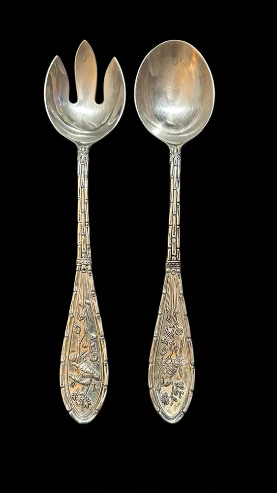 Bombay Silver Plate Salad Serving Utensils Fork & Spoon 11.5” Birds Bamboo 3D Good vintage condition. Normal signs of use, there is patina and minor scratches. The boxes has some scuffs and scratches. Please study pictures carefully before purchasing Feel free to ask us any questions. Thank you for visiting our store! Clt