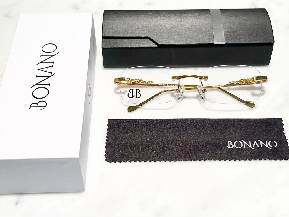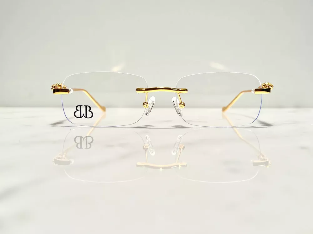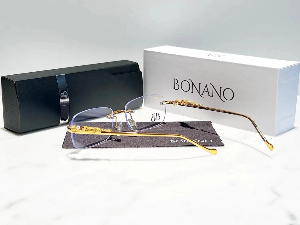 Brand: Bonano Model: Giaguaro Size: 54-18-140 Color: Gold :Handmade stainless steel construction plated in 18k gold :Handmade Jaguar adorns both left & right temple :18k gold plated metal frame inlay, temple and segments :Bonano Signature logo inlay inner right temple : Bonano CR-39 Non Prescription Clear Demo Lenses. :Comes with Bonano storage box, cleaning cloth, hard-case & frames + lenses :Frame Size 54-18-140 SHARE SHARE ON FACEBOOK TWEET TWEET ON TWITTER PIN IT PIN ON PINTEREST