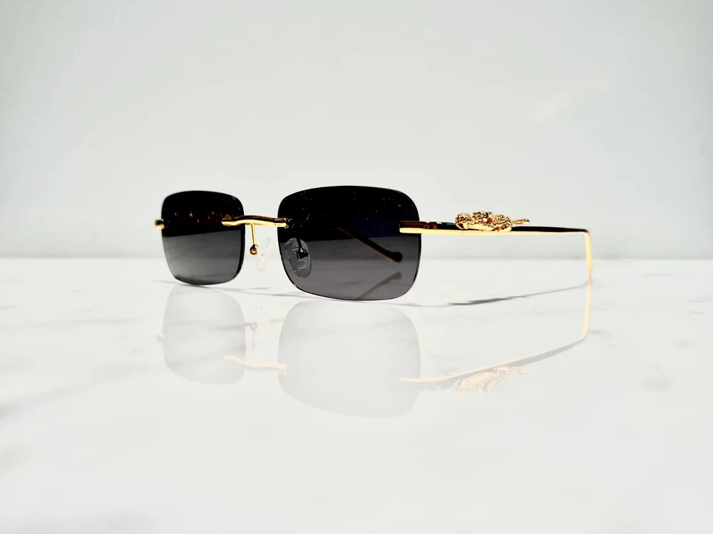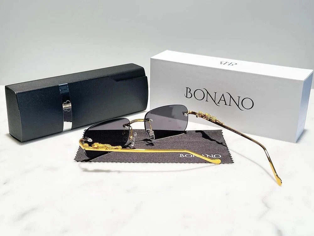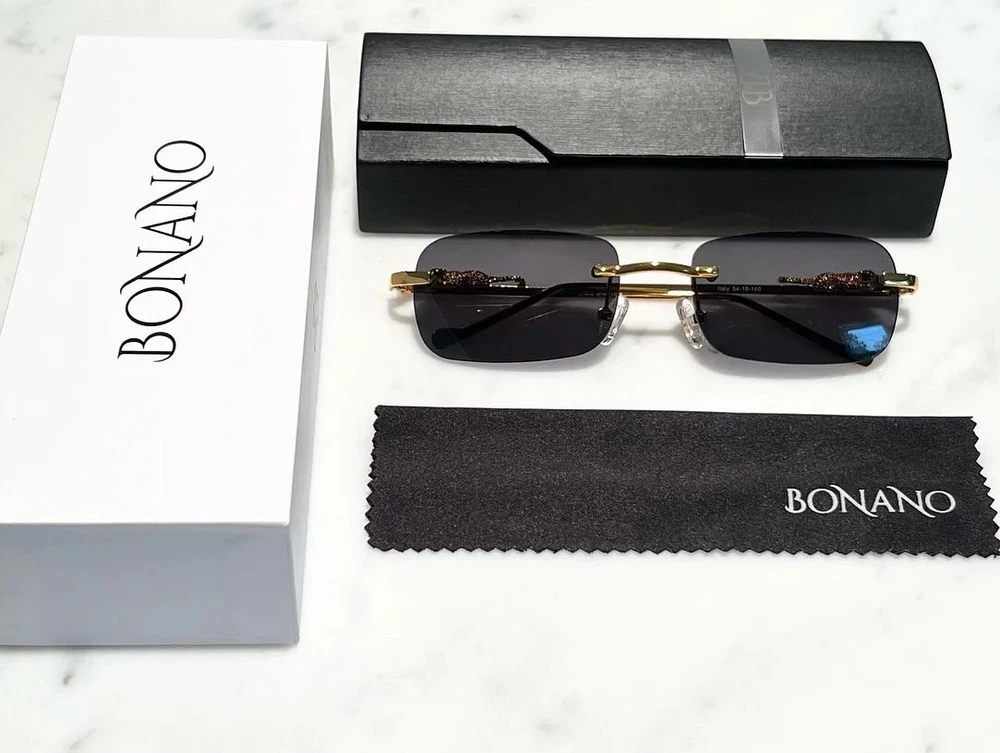 Brand: Bonano Model: Giaguaro Size: 54-18-140 Color: Gold :Handmade stainless steel construction plated in 18k gold :Handmade Jaguar adorns both left & right temple :18k gold plated metal frame inlay, temple and segments :Bonano Signature logo inlay inner right temple : Bonano CR-39 Non Prescription Clear Demo Lenses. :Comes with Bonano storage box, cleaning cloth, hard-case & frames + lenses :Frame Size 54-18-140 SHARE SHARE ON FACEBOOK TWEET TWEET ON TWITTER PIN IT PIN ON PINTEREST