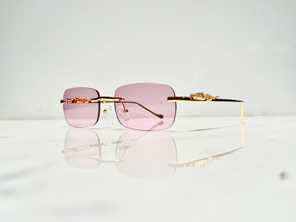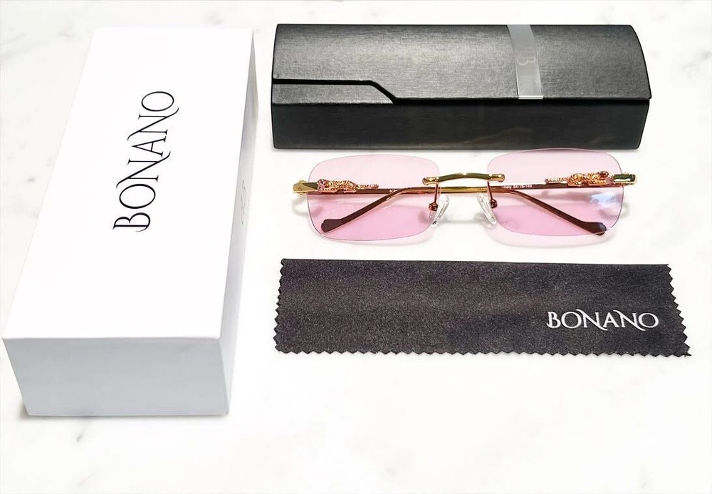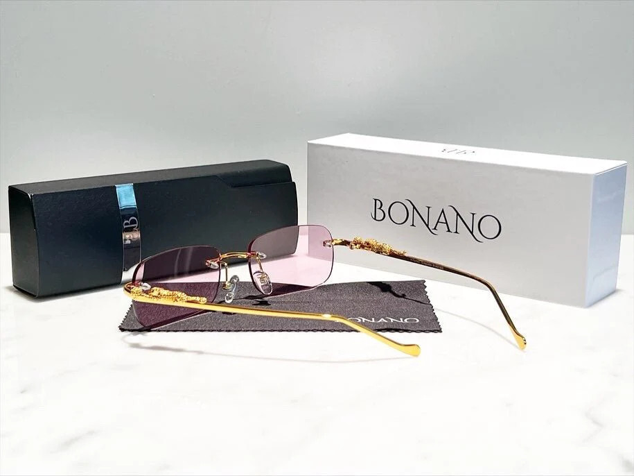 Brand: Bonano Model: Giaguaro Size: 54-18-140 Color: Gold :Handmade stainless steel construction plated in 18k gold :Handmade Jaguar adorns both left & right temple :18k gold plated metal frame inlay, temple and segments :Bonano Signature logo inlay inner right temple : Bonano Pink Rose Lenses. :Comes with Bonano storage box, cleaning cloth, hard-case & frames + lenses :Frame Size 54-18-140 SHARE SHARE ON FACEBOOK TWEET TWEET ON TWITTER PIN IT PIN ON PINTEREST