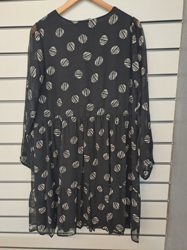 This elegant black chiffon dress from Bonmarche is a must-have for any woman's wardrobe. The dress features a fit and flare style with a knee-length hemline, making it perfect for any occasion. The long sleeves and round neckline provide a classic look, while the pullover closure ensures a comfortable fit. Made from high-quality polyester material, this dress is both durable and stylish. The dress is designed for plus-size women and is available in size 26, The dress is perfect for any woman who wants to look and feel her best.