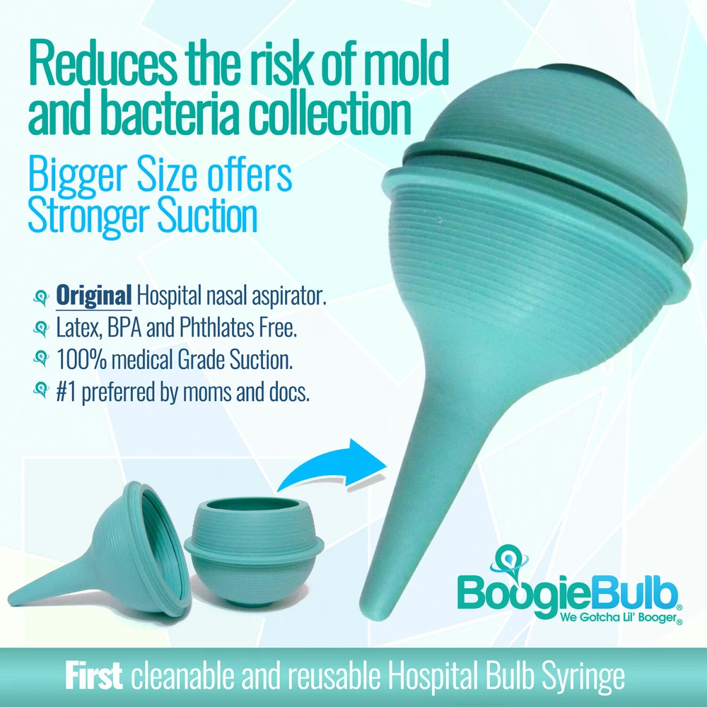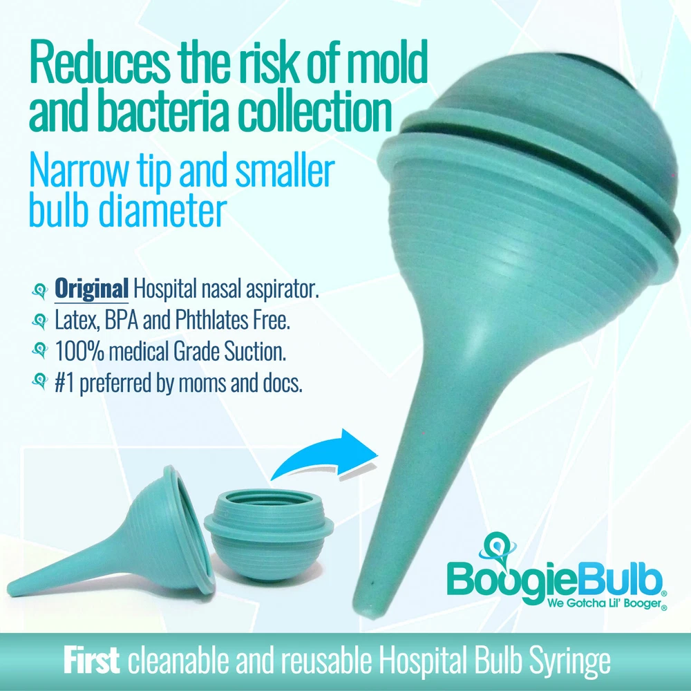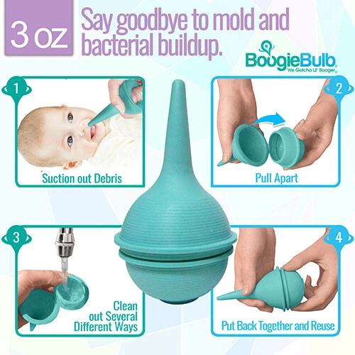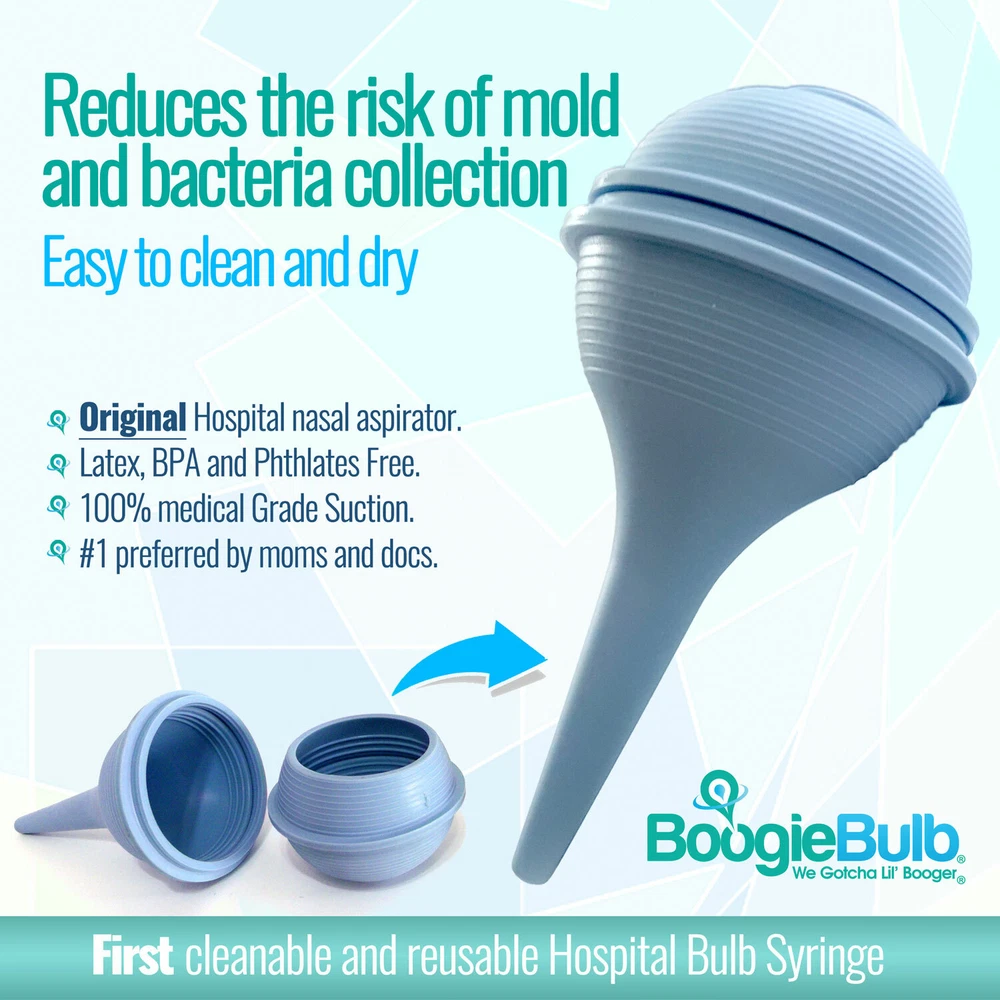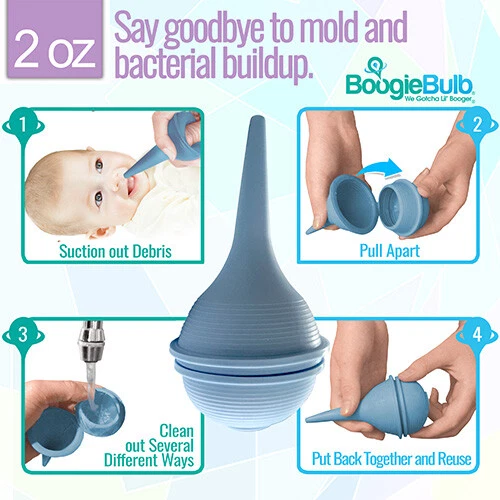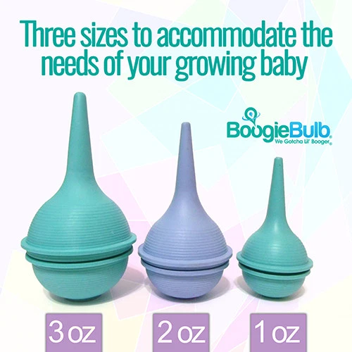 BoogieBulb® Baby Nasal Aspirator Cleanable & Reusable Bulb Syringe Mix and Match Sizes for discounts BoogieBulb is a mother developed, doctor recommended, cleanable and reusable bulb syringe. BoogieBulb offers superior medical grade suction that is the standard in keep your infant/toddler nasal passages naturally snot-free. BoogieBulb's patent-pending, innovative design allows you to simply open the nasal bulb syringe at the center for easy cleaning and disinfection. Boogie Bulb Features : Superior medical grade suction BPA, Phthalate, Latex Free Narrow tip & Ridging for easy grasping Opens at center for easy cleaning & disinfection Available in 3 sizes BoogieBulb Benefits: Helps bring relief to runny noses Reduces risk of mold & bacteria collection Non-toxic materials for your child's safety Easy to use Easy to clean Which Size is right for your baby? 1 oz - Great for preemies & smaller newborns, cats and other small pets 2 oz - Newborns and older babies 3 oz - Larger babies, toddlers, adults