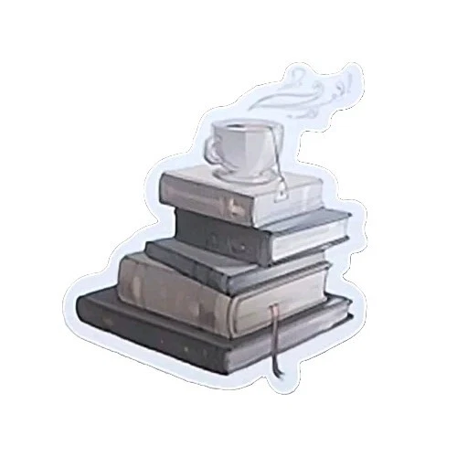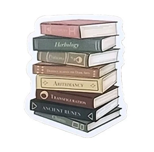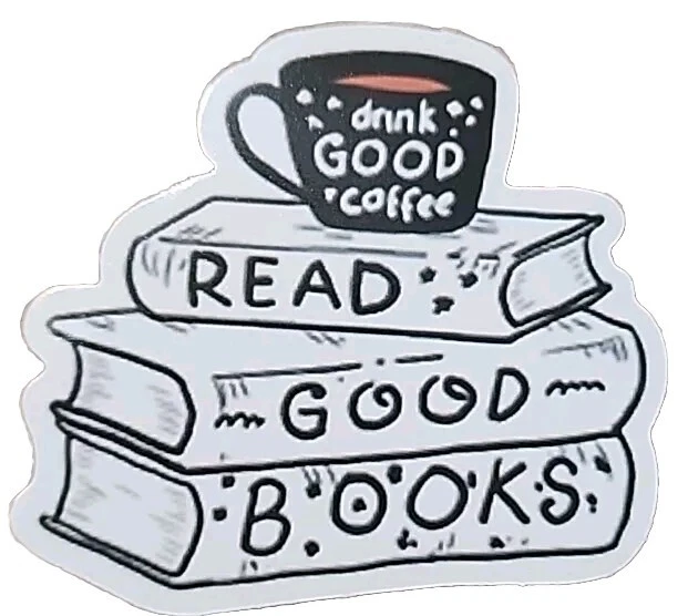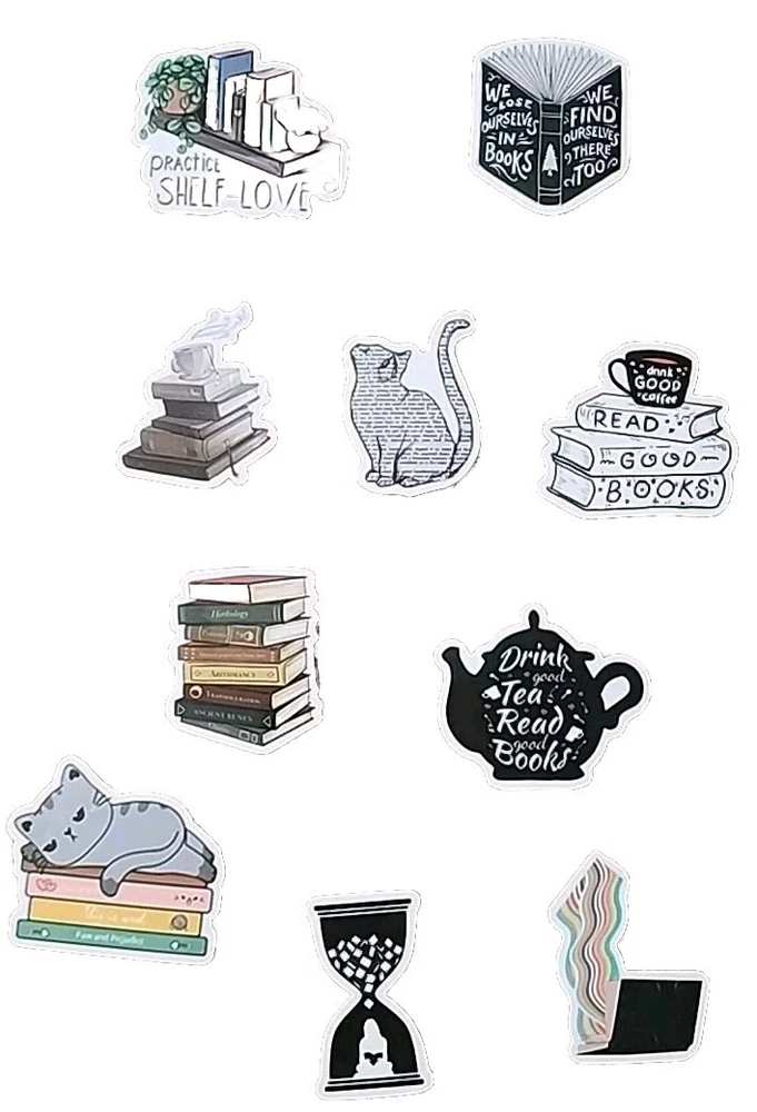 The product is a set of 10 diary, planner, or scrapbook stickers featuring cats, books, plants, reading, and bookish themes.