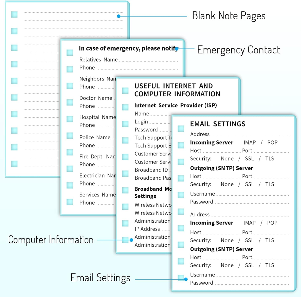Forvencer Password Book with Individual Alphabetical Tabs, 4"x5.5" Small Password Notebook, Spiral Password Keeper, Internet Address and Password Organizer, Password Logbook for Home Office, Sky Blue Individual A-Z Tabs for Quick Access: No need for annoying searches! With individual alphabetical tabs, this password keeper makes it easier to find your passwords in no time. It also features an extra tab for your most used websites. All the tabs are laminated to resist tears. Handy Size & Premium Quality: Measuring 4.2" x 5.4", this password notebook fits easily into purses or pockets, which is handy for accessibility. With sturdy spiral binding, this logbook can lay flat for ease of use. 120 GSM thick paper to reduce ink leakage. Never Forget Another Password: Bored of hunting for passwords or constantly resetting them? Then this password book is absolutely a lifesaver! Provides a dedicated place to store all of your important website addresses, emails, usernames, and passwords. Saves you from password forgetting or hackers stealing. Simple Layout & Ample Space: This password tracker is well laid out and easy to use. 120 pages totally offer ample space to store up to 380 website entries. It also provides extra pages to record additional information, such as settings, card information, and more. Discreet Design for Secure Password Organization: With no title on the front to keep your passwords safe, it also has space to write password hints instead of the password itself! Finished with an elastic band for safe closure. Product Description Alphabetized pages Keep your login details organized in one place. Features individual A-Z tabs for quick reference. Store important and commonly used login details at the front of the book to access them quickly. Keep all your computer-related information to hand and never miss them again. settings Record the details of your accounts in a dedicated section. Extra Lined Pages Write down any extra information on the blank lined pages for ease of use. 1 Alphabetized pages 2 Most visited websites 3 Computer Information 4 settings 5 Blank Note Pages 1 Laminated Tabs 2 Back Inner Pocket 3 No-bleed Paper 4 Elastic Strap Portable Size Perfect Size to Keep Your Writings Handy and Secure. Make Decent Gifts
