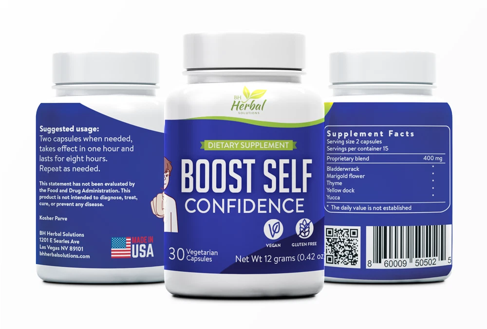 Boost self confidence and self-esteem Feel more self-assured Removes mental blocks that make it difficult to look up to oneself 100% natural and herbal. No preservatives, fillers, parabens, artificial sweeteners, dyes, or flavors. Gluten and lactose free. Everyone lacks confidence occasionally but people with low self-esteem are insecure and feel unhappy or dissatisfied with themselves most of the time. Typically, a person with low self-esteem: Is extremely critical of themselves Downplays or ignores their positive qualities Judges themselves to be inferior to their peers Uses negative words to describe themselves such as stupid, fat, ugly or unlovable Has discussions with themselves (this is called ‘self-talk’) that are always negative, critical, and self blaming Assumes that luck plays a large role in all their achievements and doesn’t take credit for them Blames themselves when things go wrong instead of taking into account other things over which they have no control such as the actions of other people or economic forces Doesn’t believe a person who compliments them. Denigrates results at work or school. Constantly compares their life to what they see on social media. Often have a negative body image or feelings about appearance. May have lower levels of achievements or skills. Constantly feel the need to conform or get approval from peers. How can Boost Self Confidence help? BH Herbal Solutions’ Boost Self Confidence helps to boost self-esteem, removing blocks that make it difficult to look up to oneself or express oneself with greater confidence. Boost your confidence the natural way with our herbal supplement! Made with a blend of powerful herbs and botanicals known to enhance self-confidence, this supplement is the perfect addition to your daily routine. Say goodbye to self-doubt and hello to a more vibrant, confident you! Our herbal blend helps you feel more self-assured and ready to take on whatever challenges come your way. Our supplement is easy to take, with no harsh side effects. Simply add it to your daily regimen and watch as your confidence grows. You deserve to feel your best, and our Boost Self Confidence herbal supplement can help you achieve just that! Suggested Usage: Two capsules when needed, takes effect in one hour and lasts for eight hours. Repeat as needed.