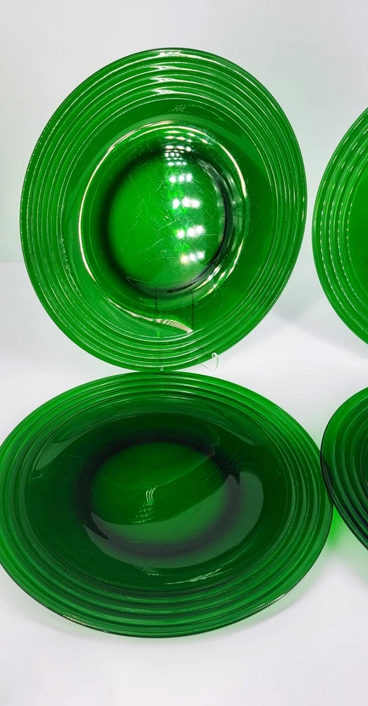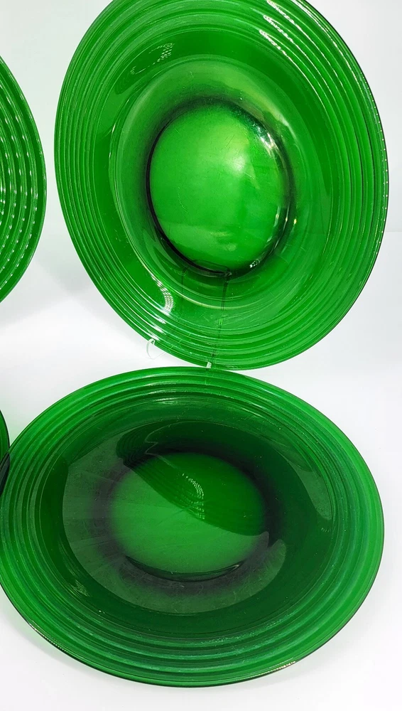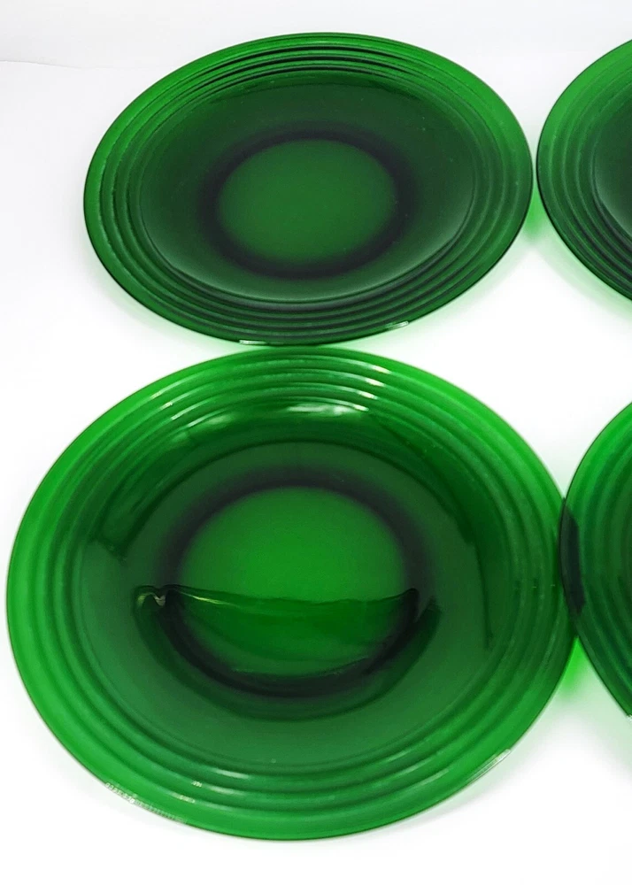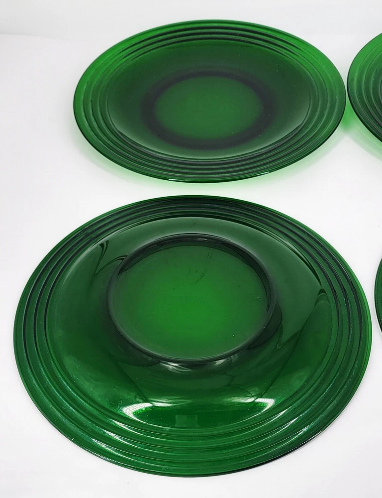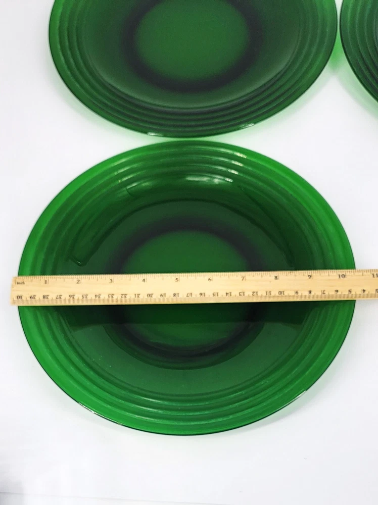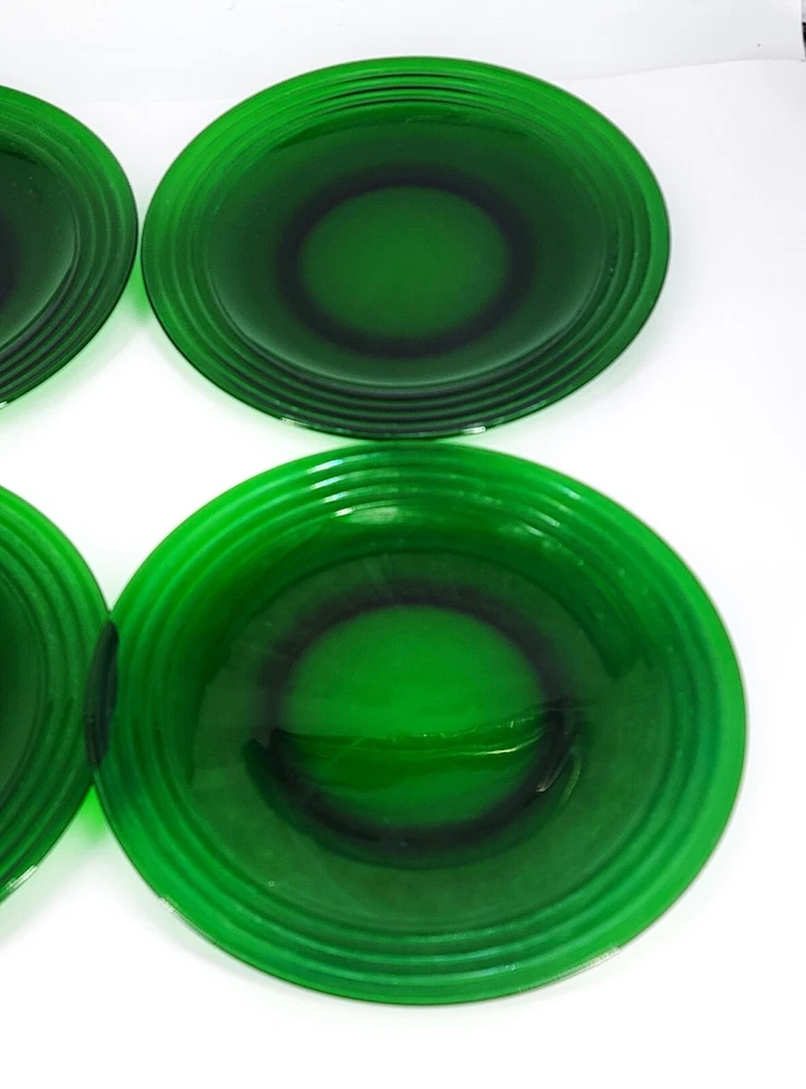 BRAND: Bormioli Rocco Forum Emerald Green Italian Glass MCM Set of 4 Plates. Made in Italy. COLORWAY: Emerald Green SIZE: Approximately 10.5 Inches Across. CONDITION: These 4 emerald green glass plates by Bormioli Rocco MCM Emerald Green Italian Glass. They are beautiful and have no signs of chips or cracks. They make excellent individual serving plates or as chargers under smaller plates. The color is stunning for the Holidays or even St. Patrick's Day. Due to the age (Mid-Century) of these lovely plates utensil marks are to be expected Please see my photos for exact details. Thank you so much for shopping with me today and hope you have a wonderful week!!