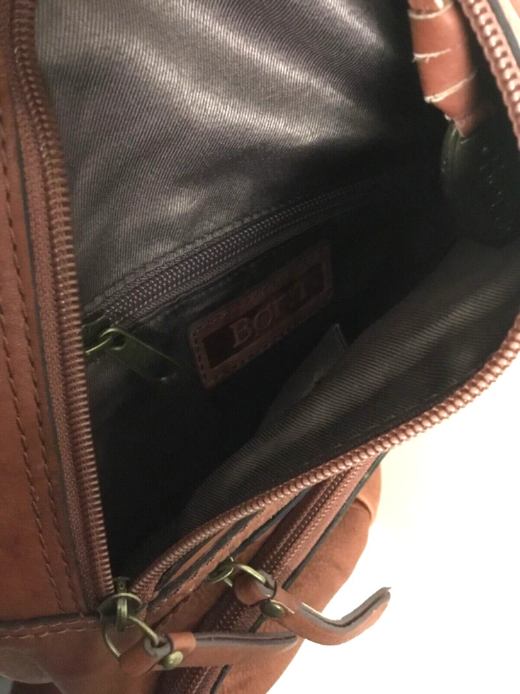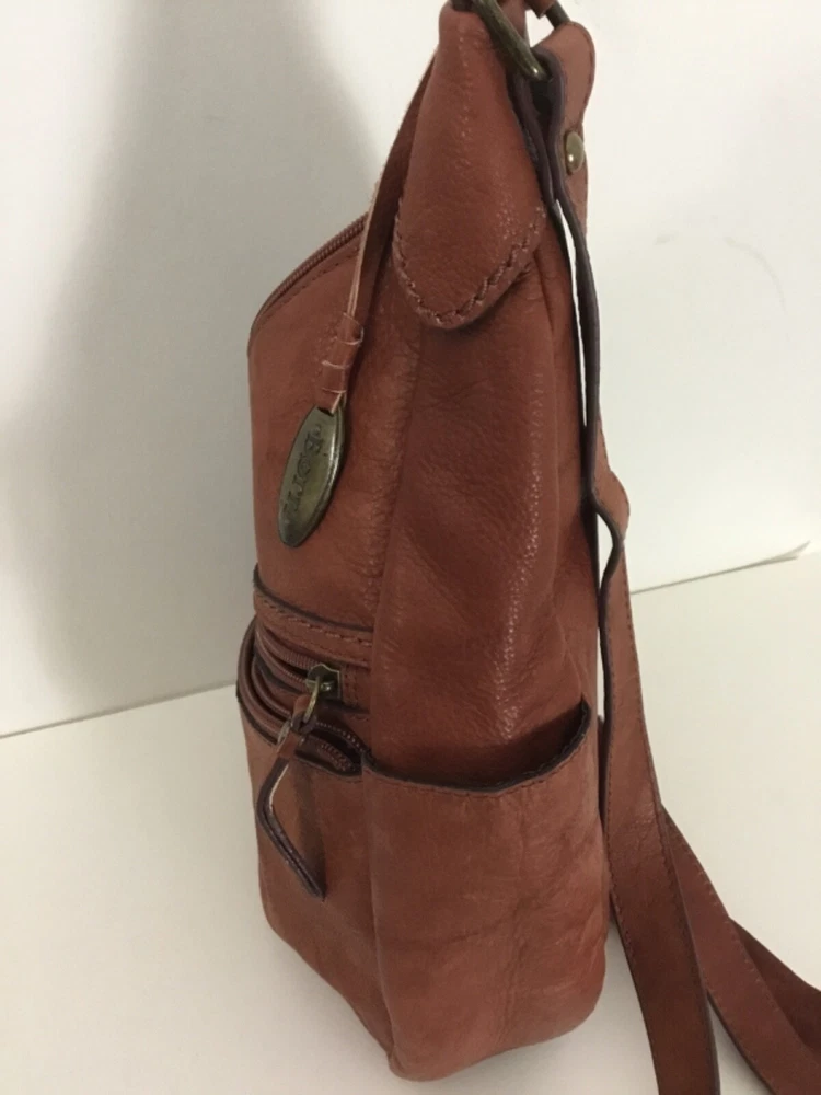 This bag has three pockets in the front, one on the side and zippered pocket inside.