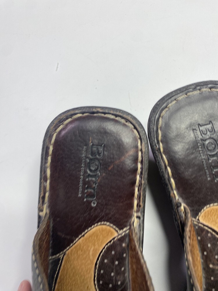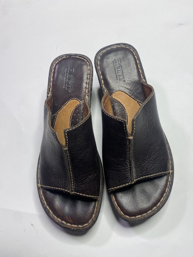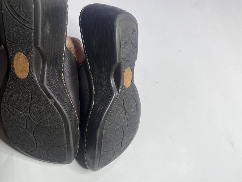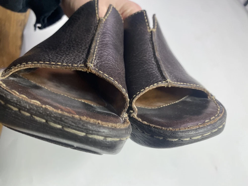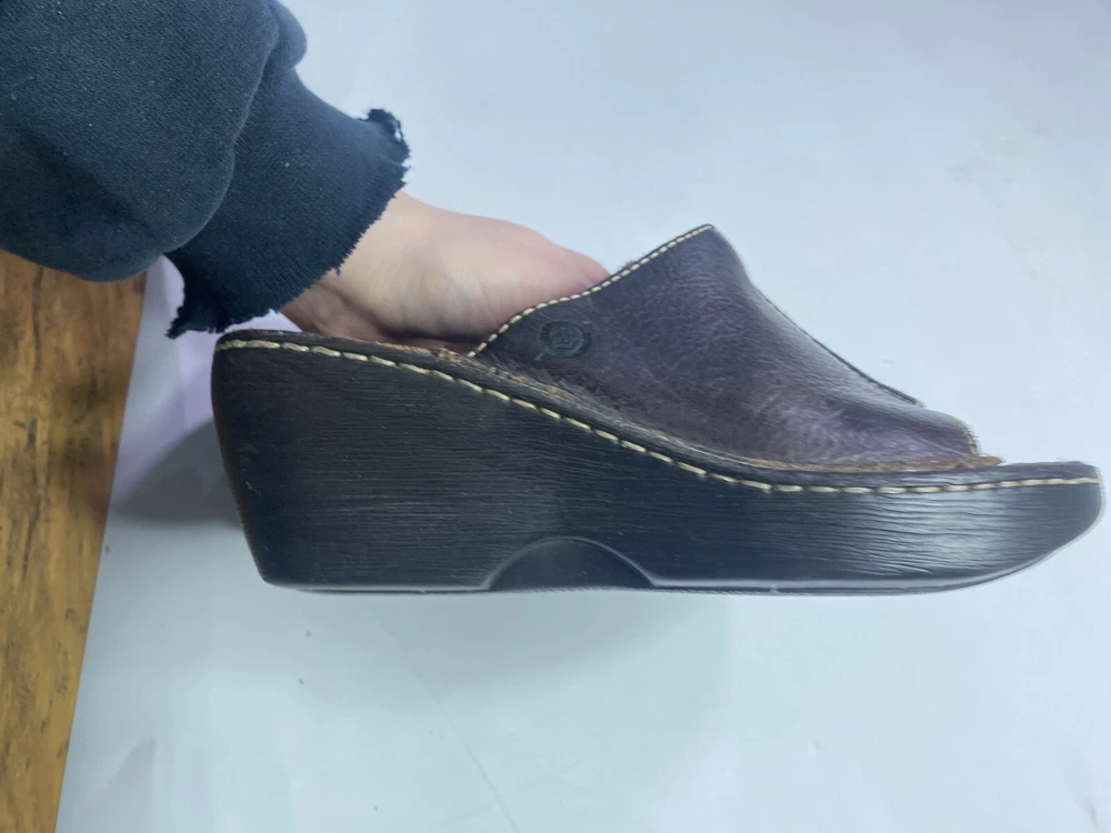 Born Women's Mule Size 7 EU 38 Clog Low Wedge Slip On Shoe Brown Leather Hippie. Condition is Pre-owned. Shipped with USPS Ground Advantage.