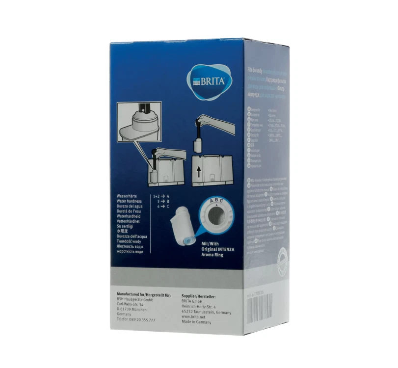 Bosch Brita Intenza 17000705 Water Filter for Coffee Machines 1) Water filter cartridge for coffee machines. 2) Protects your device from limescale, chlorine, lead and copper. 3) Improves the taste and aroma of your coffee. 4) Adjustable according to water hardness. 5) Always remove the filter before running your device in the descaling program and replace it after 50 litres of use (400 cups or every two months).