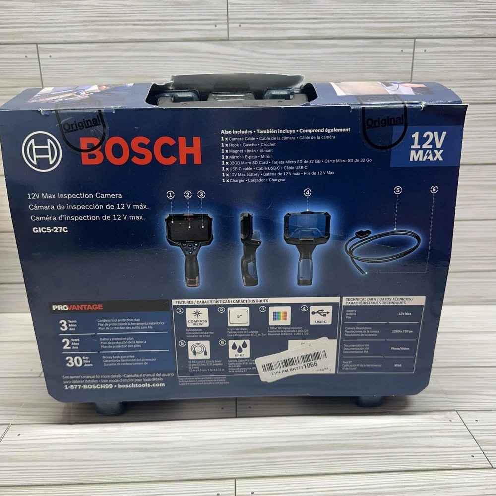 Image Cable Length:150 cmCamera Cable Protection:IP 67Brand:BoschAuto Orientation:YesMicroSD Card Slot:Supports up to 256GBCamera Cable:IP 67 (waterproof up to 30 minutes)Product:IP 54 (dust and splash resistant)Focus Distance:30-80 mmDimensions:242 x 140 x 66 mmModel:GIC 5-27CType:Inspection CameraPower Source:10.8V or AA (x4) batteriesScreen Resolution:1280 x 720 pixelsVoltage:12V / 10.8V Li-ion batteryItem Weight:0.7kgField of View (FOV):75°MPN:GIC 5-27CDisplay Size:5 inch