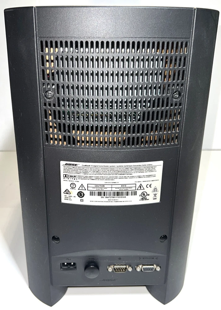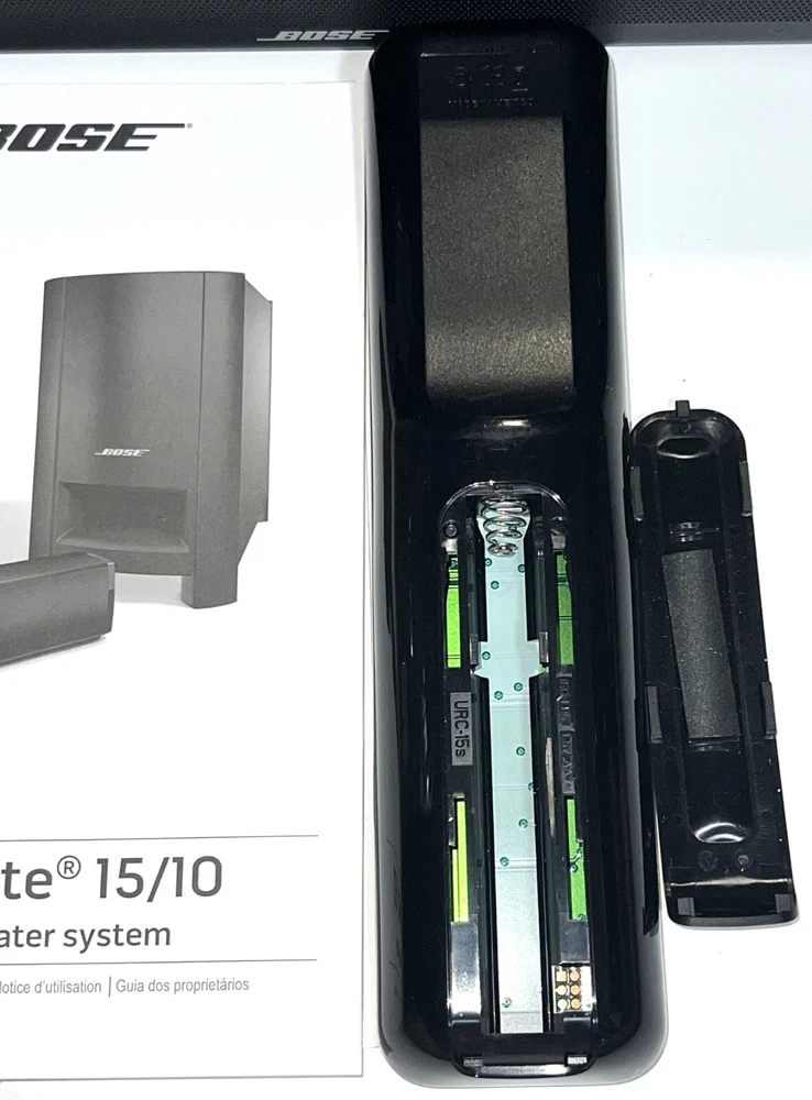 Bose CineMate 15 Home Theater Cinema Speaker System With IR Remote Control, Soundbar, Digital Optical Cable, Power Cords, and Instruction Manual. Batteries not included. Great gently used tested working condition. Minor normal usage wear including 4 small dings/on the top side edges, see pics.
